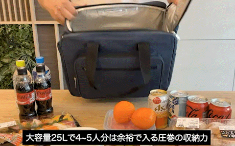 氷や飲料はもちろん、野菜や果物、食材まで4~5人分は余裕で入る圧巻の収納力。アウトドアやピクニックはもちろん、週末のまとめ買いや日常の買い物バッグとしても大活躍。