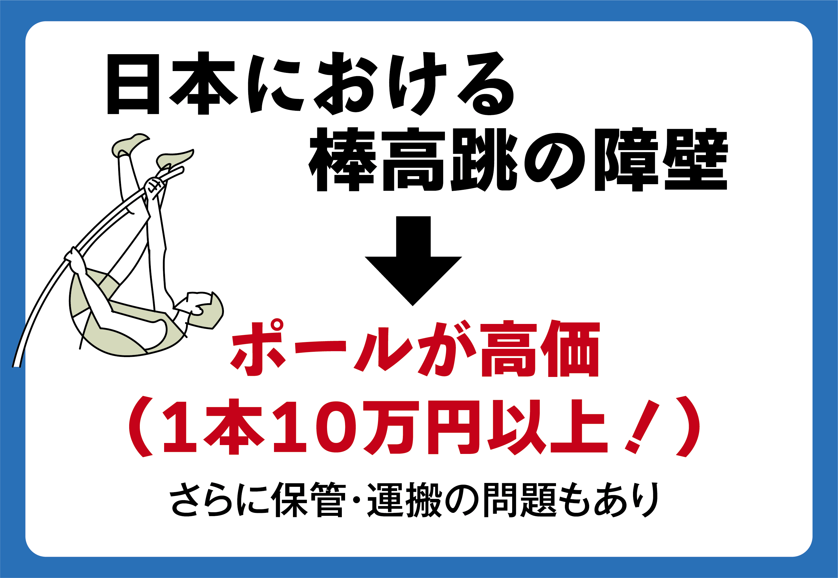 さらに大きな障壁として棒高跳に必要なポールの問題があります。ポールは非常に高価であるため、個人で購入するのは容易ではありません。年々高騰するポールの価格は、一本あたり10万円以上にもなります。