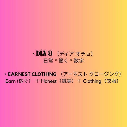 「8時間で手に入れる、永く愛せる1着。」時給1000円台の人が、1日働いて買える服。でも安っぽくない、毎日着たくなる服。ロゴは、1日= “DÍA”と、**8時間(8)**を象徴。数字8は「∞(無限)」の象徴でもあり、"あなたの努力は永く続く"という意味を込めています。