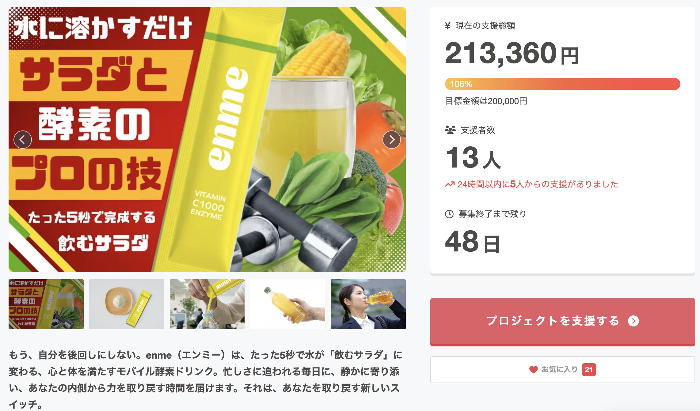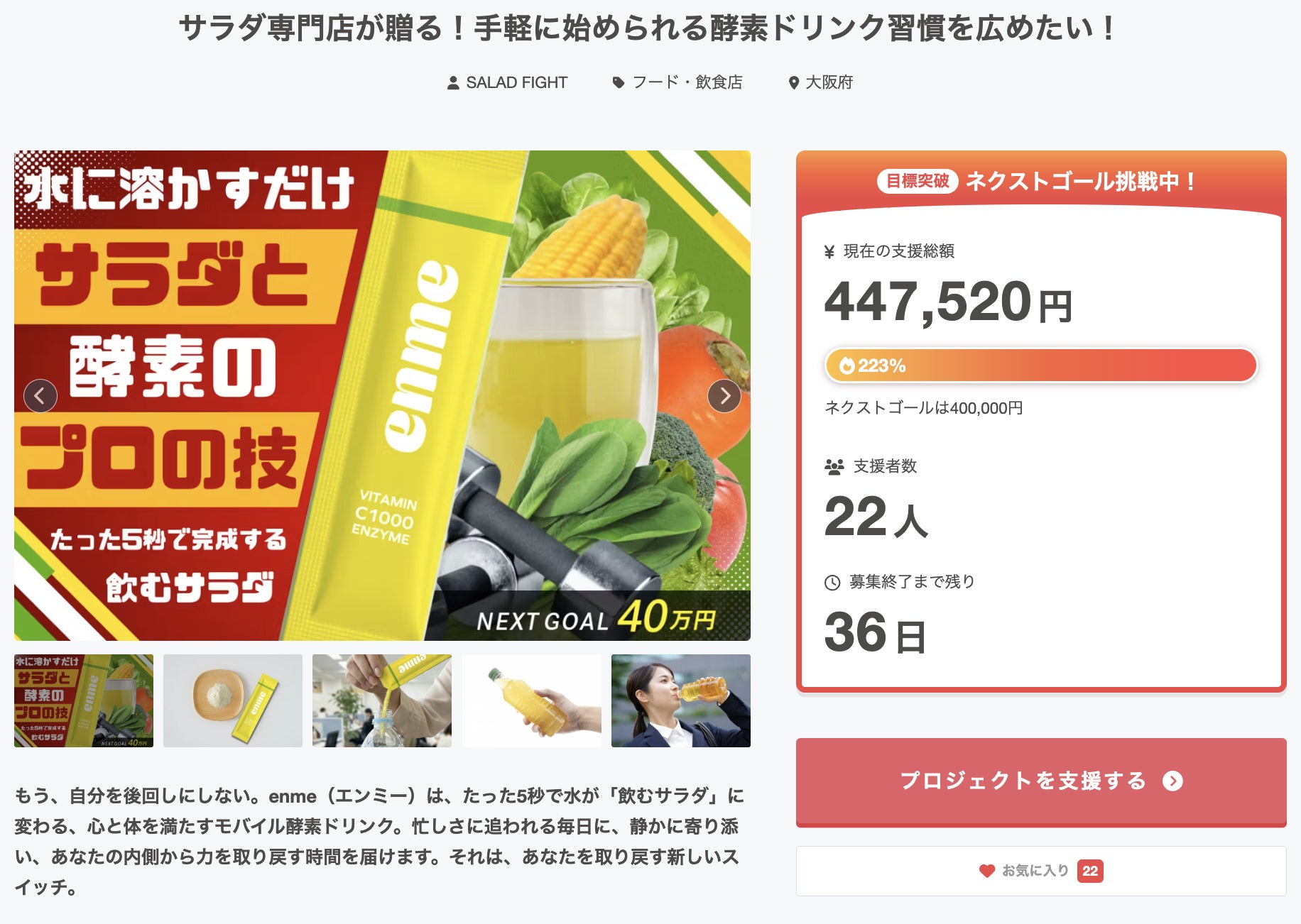• 皆様、こんにちは!SALAD FIGHTです。いつも応援いただき、本当にありがとうございます。皆様に、とびきり嬉しいご報告があります!昨日、クラウドファンディング公開からわずか2日という驚異的なスピードで、目標金額である200,000円(100%)を達成いたしました!!いち早くご支援くださった13名の皆様、そしてSNS等で温かい応援メッセージをくださった皆様、本当に、本当にありがとうございます。スタッフ一同、スマホの画面を見つめながら喜びを分かち合っております。ページにも書かせていただきましたが、enme(エンミー)は「もう、自分を後回しにしない。」をコンセプトに作られた、心と体を満たすモバイル酵素ドリンクです。サラダ専門店として、忙しさに追われる皆様に「たった5秒で自分を取り戻す新しいスイッチ」をお届けしたい。その私たちの強い想いが、こうして皆様に届き、共感していただけたことが何よりの誇りです。お気に入り登録をしてくださっている皆様へ(現在21名様!)現在、ありがたいことに21名もの方がこのプロジェクトを「お気に入り」に登録して見守ってくださっています。100%を達成し、ここからさらに勢いを増していくenmeですが、一番お得な「超早割」などの限定リターンは、枠が埋まり次第終了となります。ぜひ、このお祭り騒ぎの勢いに乗って、一番お得なタイミングで「新しい酵素ドリンク習慣」を始めてみませんか?次なる目標(ネクストゴール)に向けてプロジェクトはまだ残り48日もあります!私たちはここで立ち止まることなく、さらに多くの方へこの「飲むサラダ」をお届けするため、現在【ネクストゴール】の設定をスタッフ間で急ピッチで進めております。準備が整い次第、またこちらの活動報告で発表させていただきますので、ぜひ楽しみにお待ちください!引き続き、皆様のSNSなどでのシェア・拡散が私たちの大きな力になります。最後まで全力で走り抜けますので、SALAD FIGHTとenmeの応援をよろしくお願いいたします!▼プロジェクトページはこちらhttps://camp-fire.jp/projects/872432/viewSALAD FIGHT もっと見る