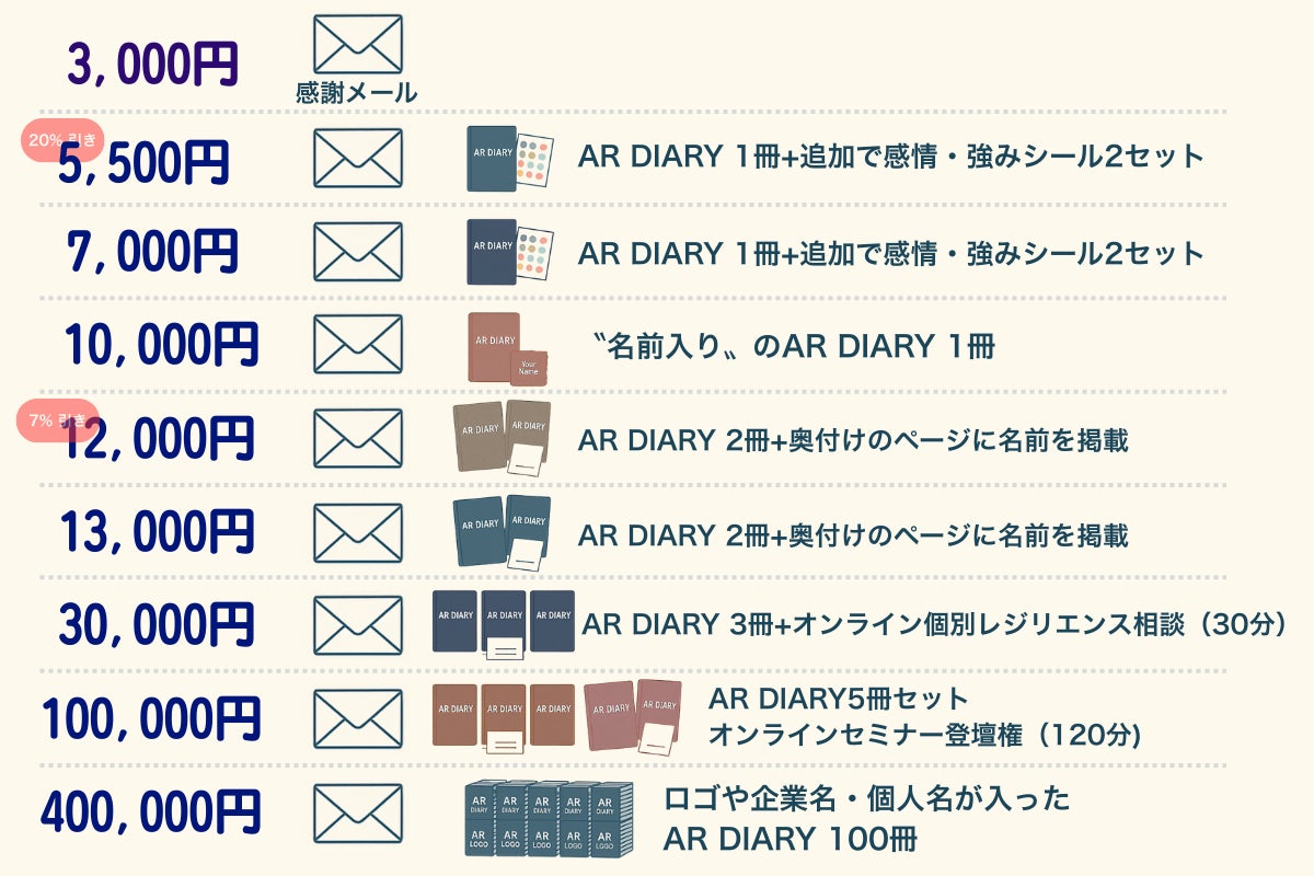 こんな、しなやかマインド手帳 AR DIARYを体験いただけるように各種リターンの方を用意させていただきました。早く購入しただけお得になるプランもご準備をしました。