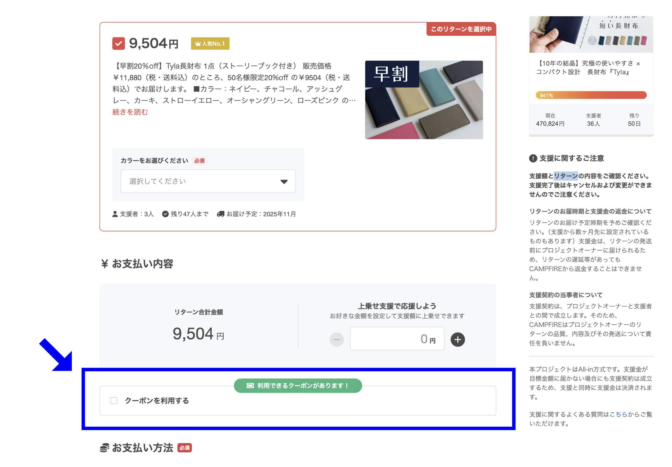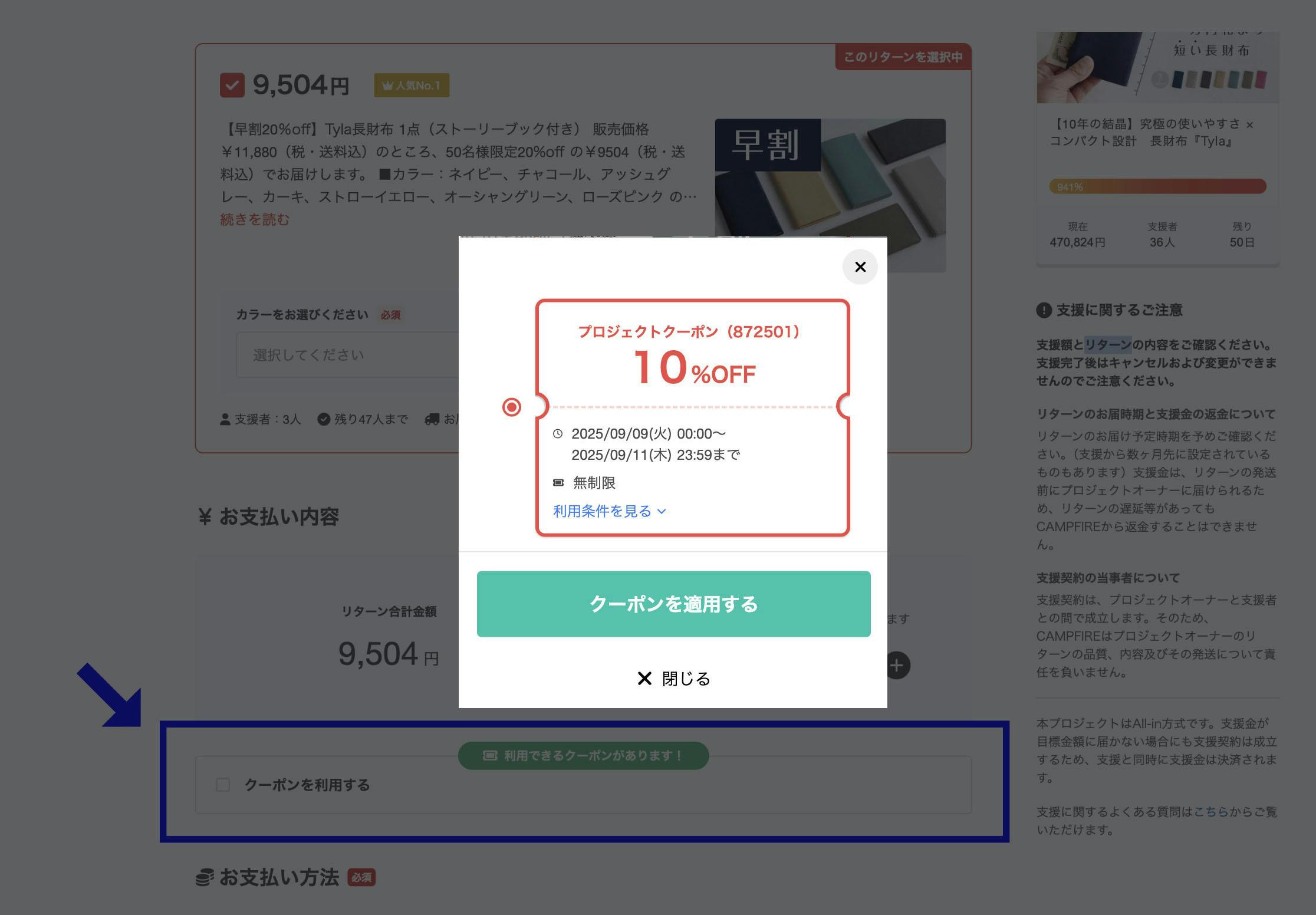 クーポンの発行方法は支援ページの「クーポンを利用する」にチェックを入れ、「プロジェクトクーポン(872501)10%OFF」を選択してください。