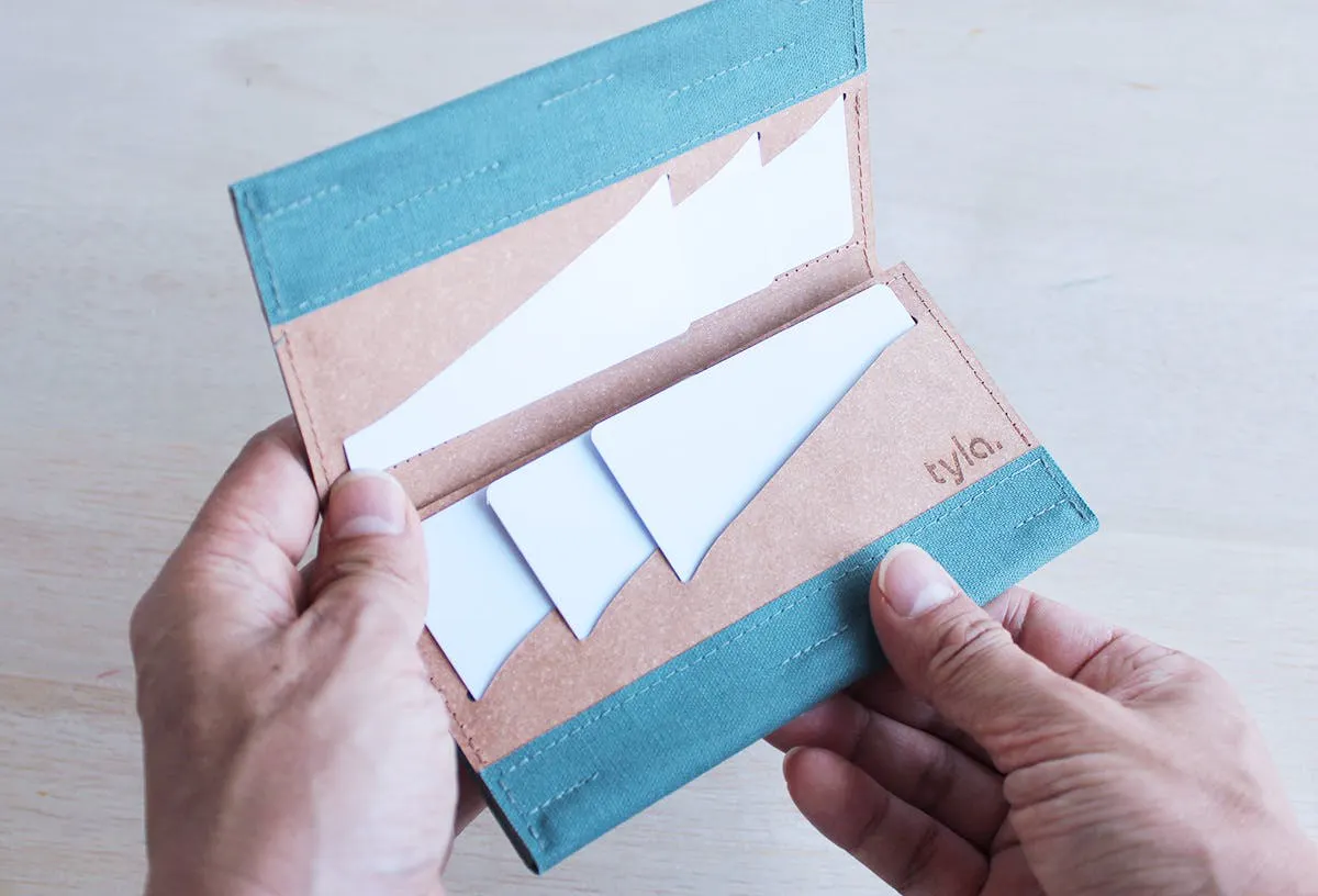 Tylaは、これらの課題を独自の設計思想で解決しています。まず構造面では、カード収納部分の角度や配置を何度も調整し、必要な枚数を収納しながらも薄さを保てる設計を実現しました。素材選びにも相当な時間をかけ、耐久性と柔軟性のバランスを取り、リサイクルレザーとラミネート生地の組み合わせを採用しました。