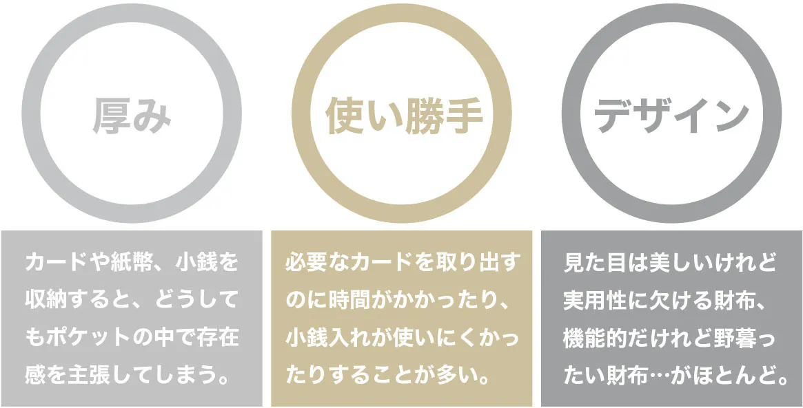 なかなか理想の財布ができないで悩んでいた時に、現金の使いやすい長財布を小さくしてはどうだろうと思い立ちました。長財布を極限まで小さくすればポケットにも無理なく入ると考えたのです。