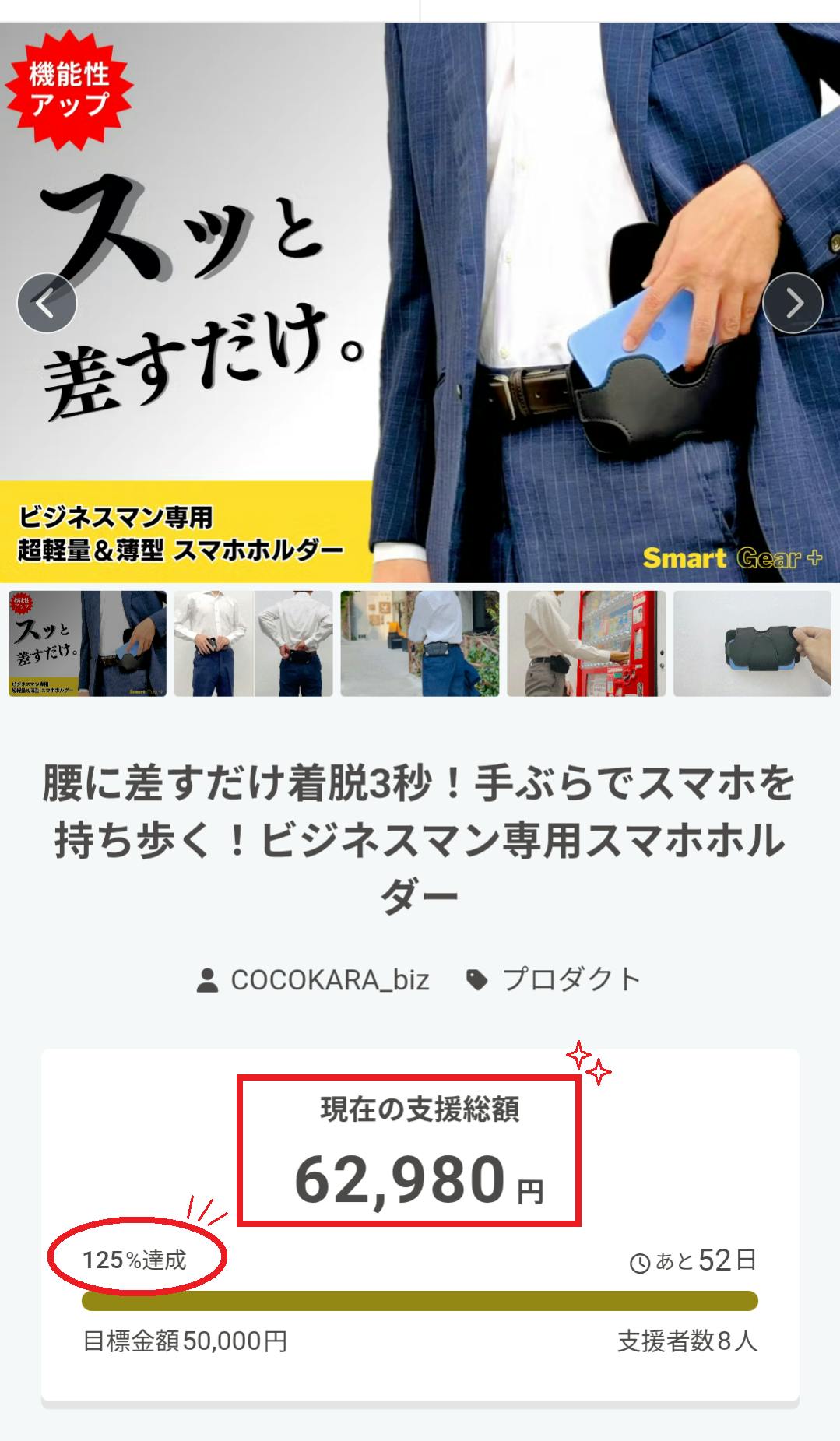 こんにちは。COCOKARAです。公開早々からのご支援ありがとうございます!皆さまからのご支援のおかげで、開始から45分で目標金額を超え 、達成率も125%を達成することができました(^^)/開始早々からたくさんの応援を頂き、本当に感謝の気持ちでいっぱいです。引き続き、機能性がアップした差すだけスマホホルダー「Smart Gear+」を一人でも多くの方にお届けできるよう、スタッフ一同頑張りますので、お知り合いの方にもご紹介いただけますと幸いです(*´ω`*)どうぞよろしくお願いいたします