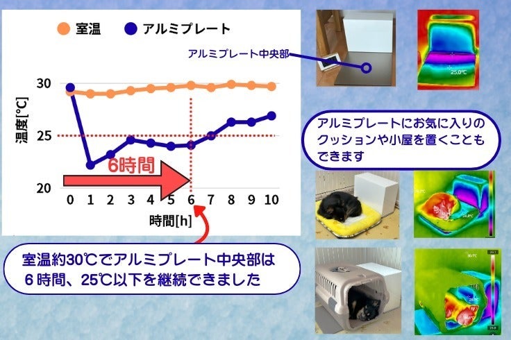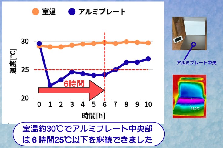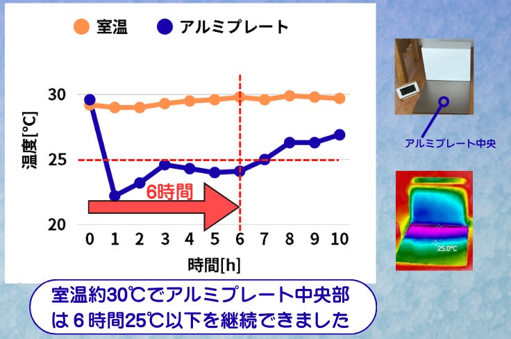 ・室温約30℃で実験した結果、アルミプレート中央部で、25℃以下の状態が6時間継続できました