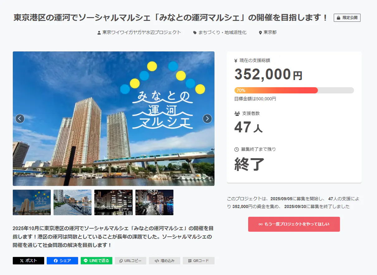 クラウドファンディング「東京港区の運河でソーシャルマルシェ「みなとの運河マルシェ」の開催を目指します!に応援を頂きありがとうございます