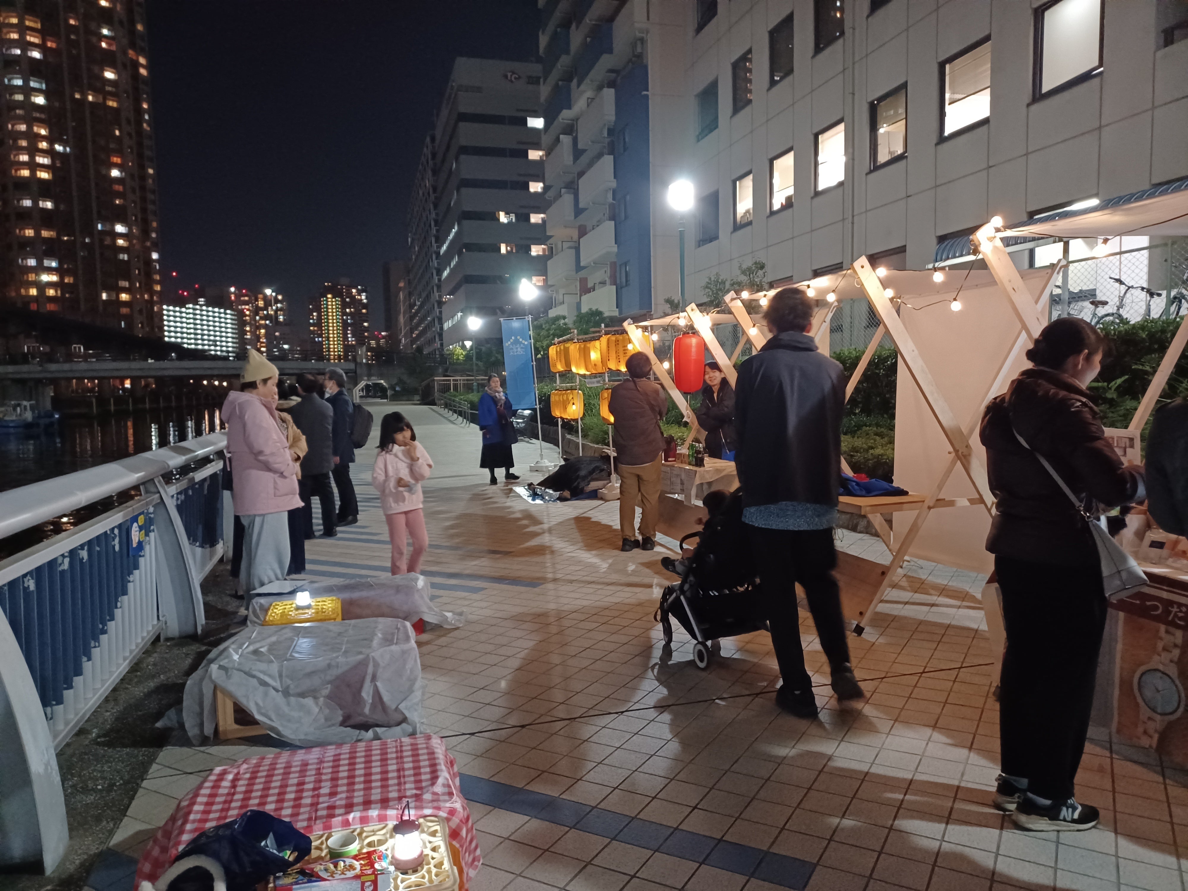 夜とはまたちがった景色になり、日射しのなかで静かに漂う水面を眺めながら、たまに走るモノレールと湾岸タワーマンションに日があたり、のどかな運河のなかでの開催でした。