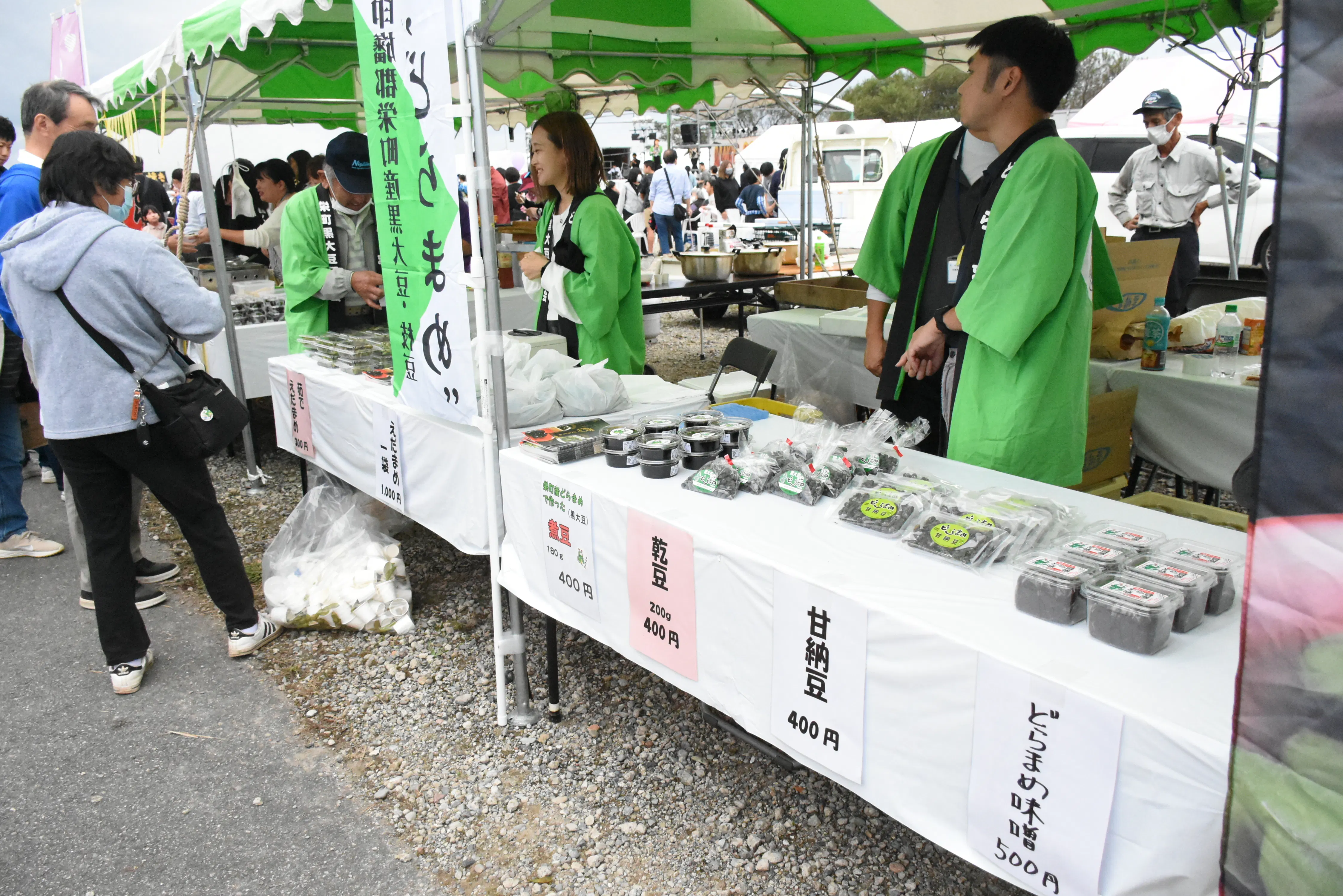 巡視船試乗体験、町特産黒大豆「どらまめ」などが並ぶ模擬店