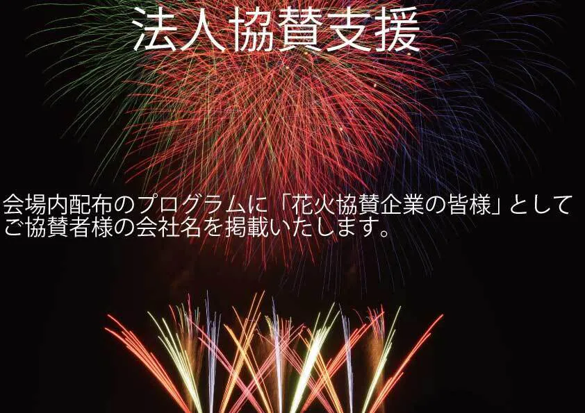 ●法人様向け● 会場内配布のプログラムに「花火協賛企業の皆様」 としてご協賛者様のお会社名を掲載します。※ご支援の先着順の掲載となります。