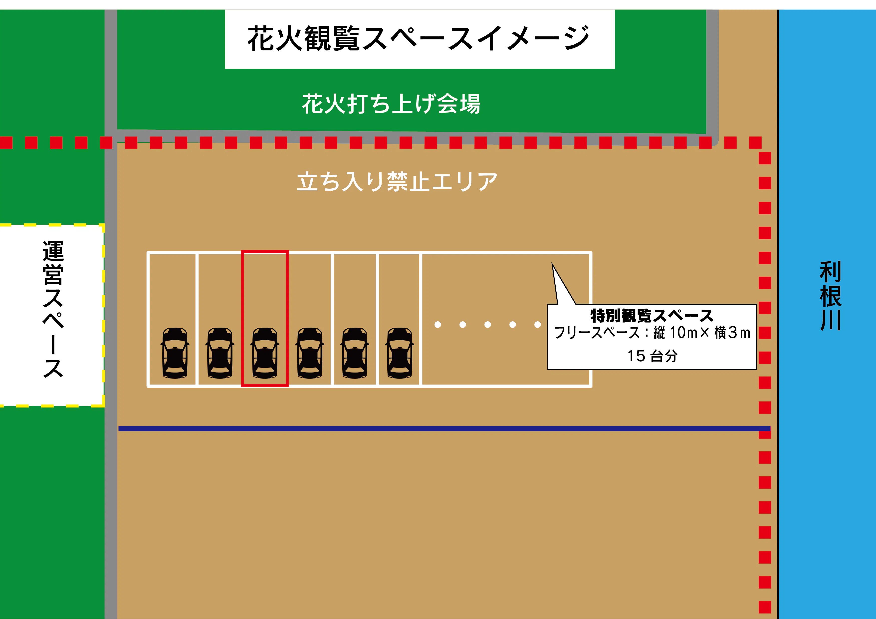 自家用車で会場に乗り入れることができ、会場まで歩く必要がありません。小さいお子さんやお年寄りなどご家族で迫力ある花火を鑑賞することができます。また、決められたスペース内(下図の赤枠)で自由に観覧できるスペースです。間近で咲き乱れる花火は圧巻です。花火撮影愛好家の方にもお勧めです。