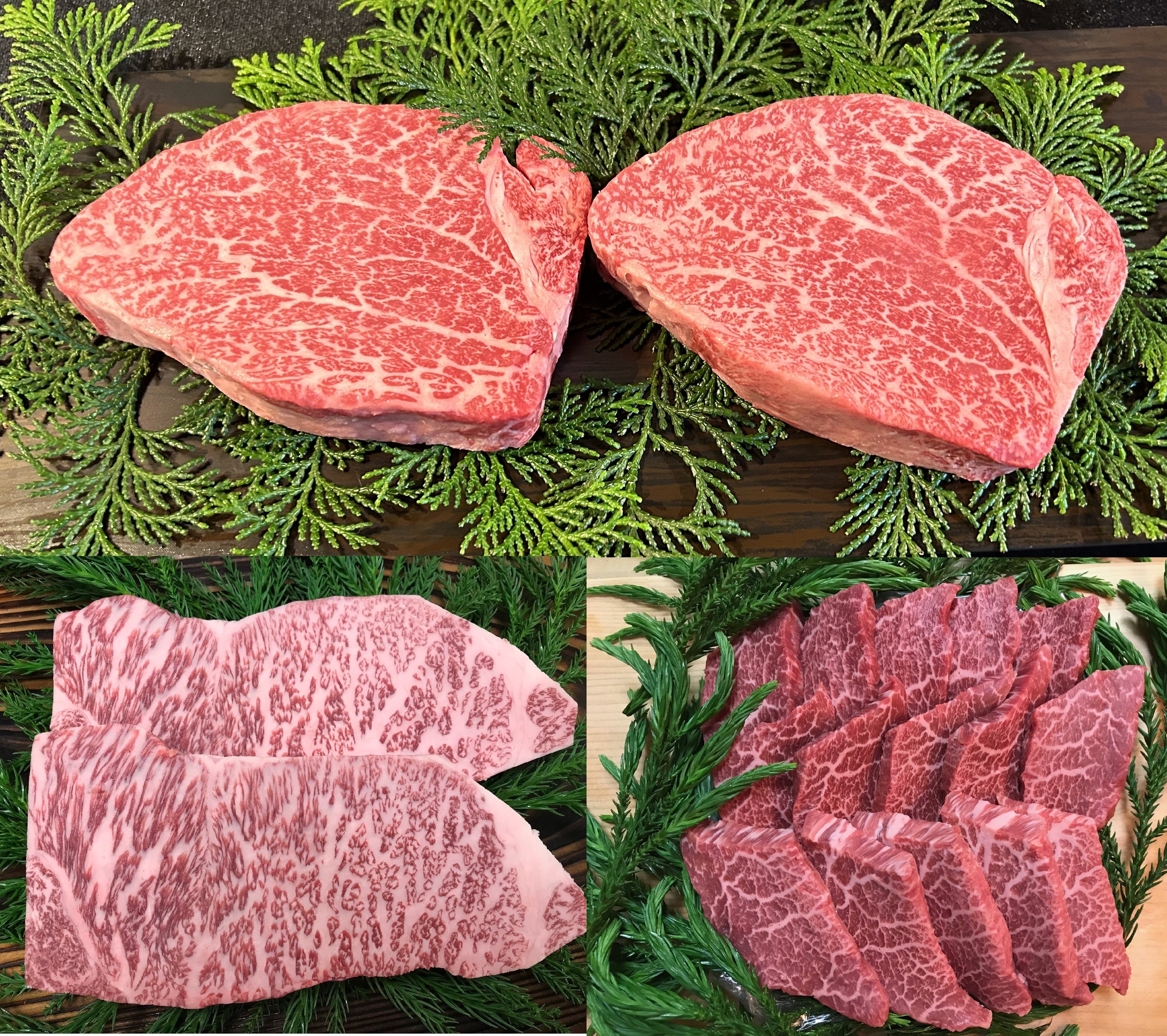 古里精肉店ご提供の飛騨牛A5等級『シャトーブリアン』、『サーロインステーキ』、『モモ肉手切り焼き肉用』をお届けします。