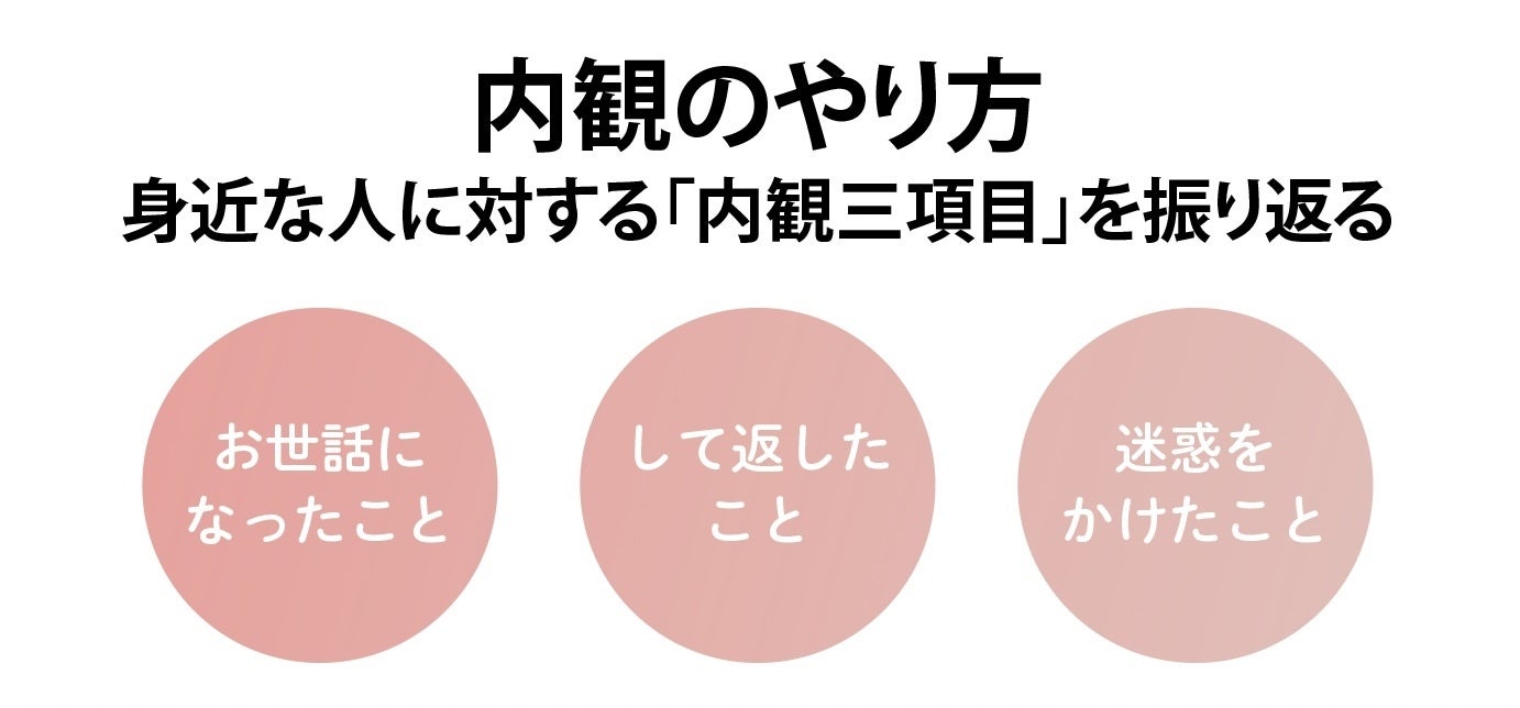 内観(ないかん) とは、自分自身を見つめ直すための日本発祥のシンプルな方法です。「お母さん」「お父さん」「友人」など特定の身近な人を思い浮かべ、3つの視点から、年を区切り、自分の過去を振り返ります。内観研修所で行う一週間の集中内観と、日々の生活の中での日常内観があります。