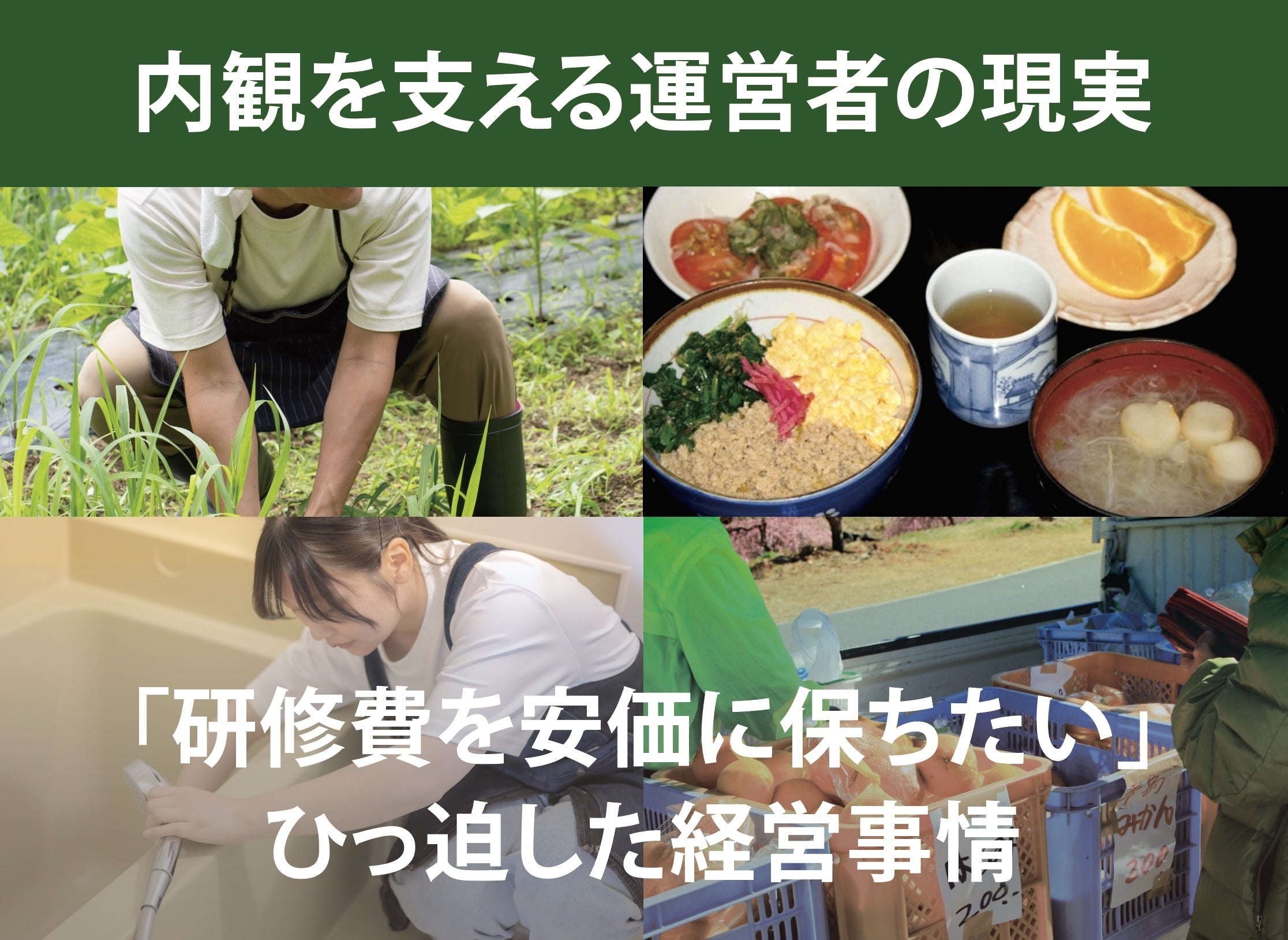内観研修者により添い、面接と生活のお世話をするために広報・営業が難しい状況。内観研修所を主体に営みたいと望んでも、家族を抱えながら、兼業をしてやっと生活ができる、という研修所も多くあります。