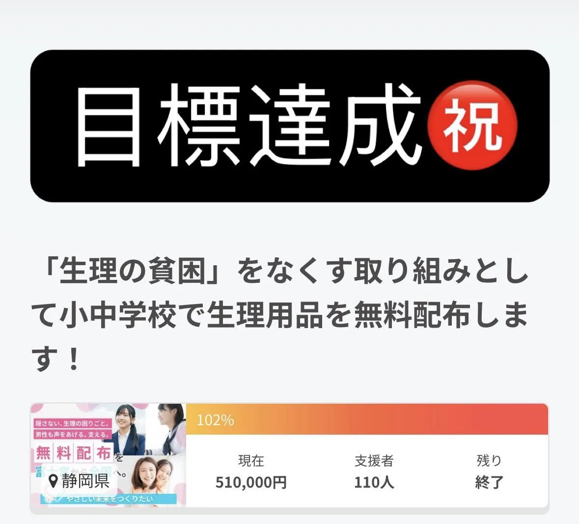 改めて、私の活動の目標は 「生理に優しい社会を作ること」 です。それを実現するための目的として、全国の小中学校のトイレに生理用品を無料で配布することを目指しています。