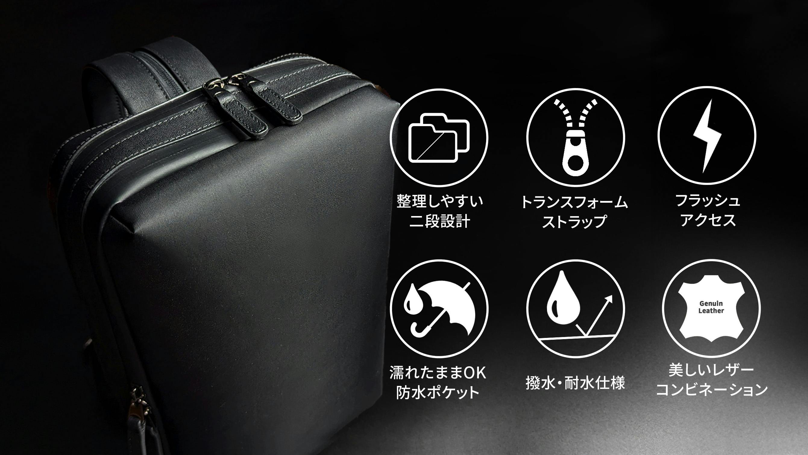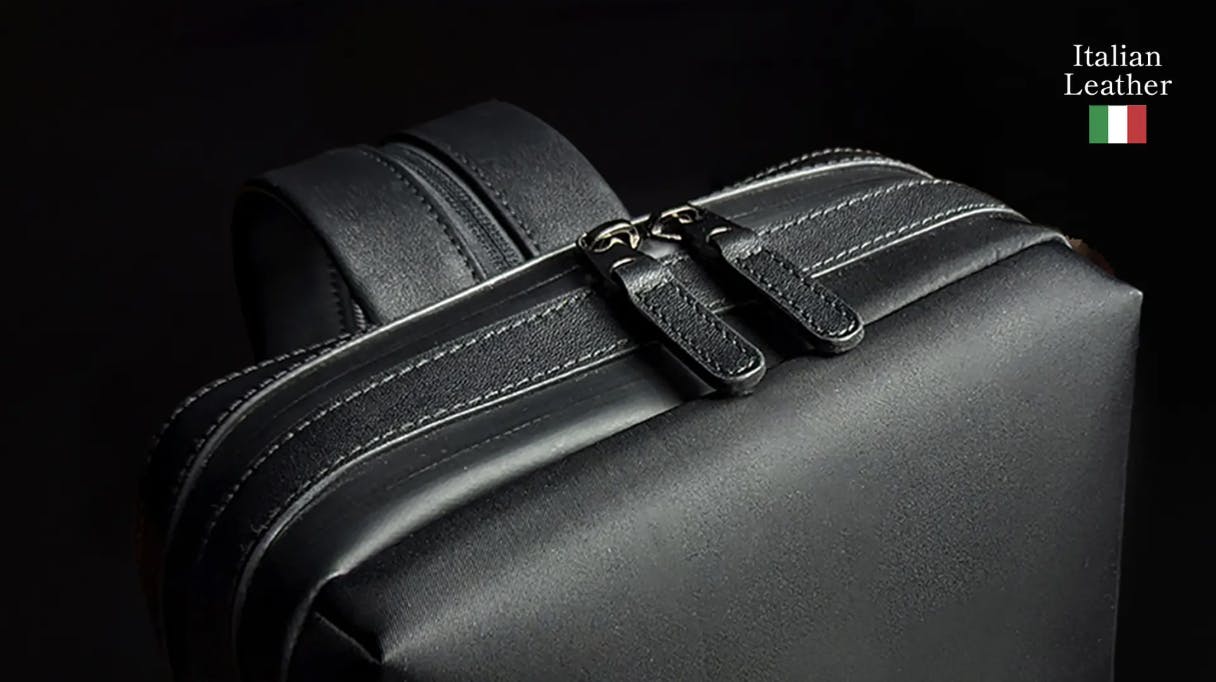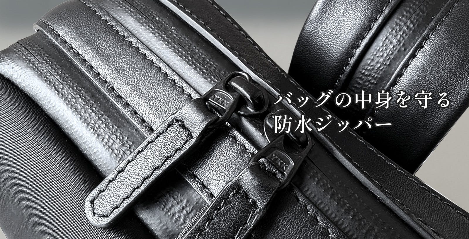 その他、ストラップやサイド面、ジッパー周りなどのディテールには耐水イタリアン牛レザーを使用しており、高密度ナイロン×牛レザーの組み合わせが、高級感を醸し出します。