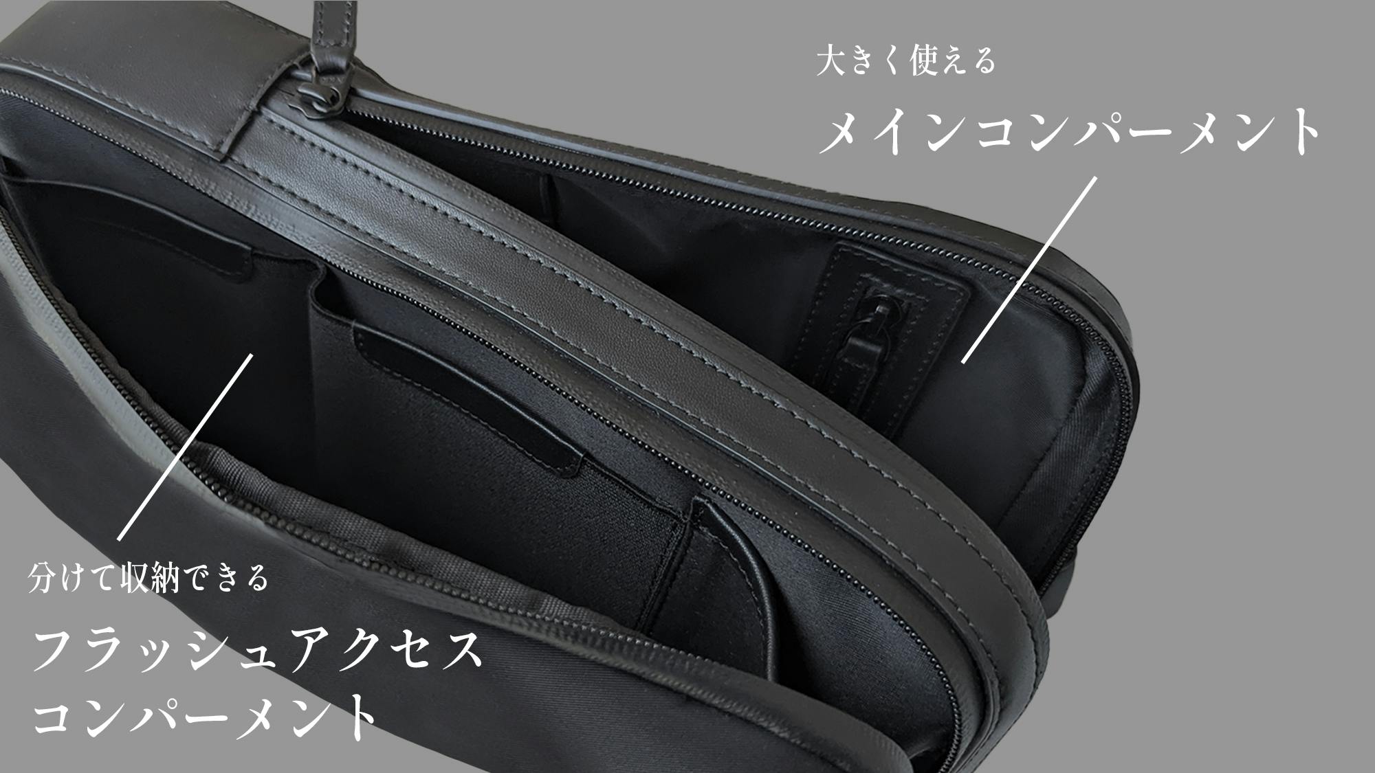 バッグの前面には【フラッシュアクセスコンパーメント】、背面には【メインコンパーメント】があり、用途にあわせて仕分けることができます。