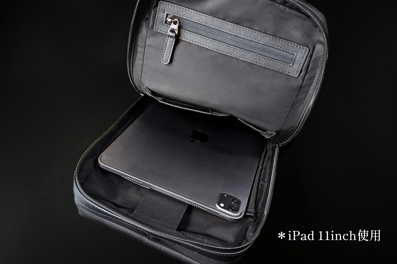 縦に開くメインコンパーメントは、カバー付きの「iPad 11inch」がスッポリと入るサイズ感です。