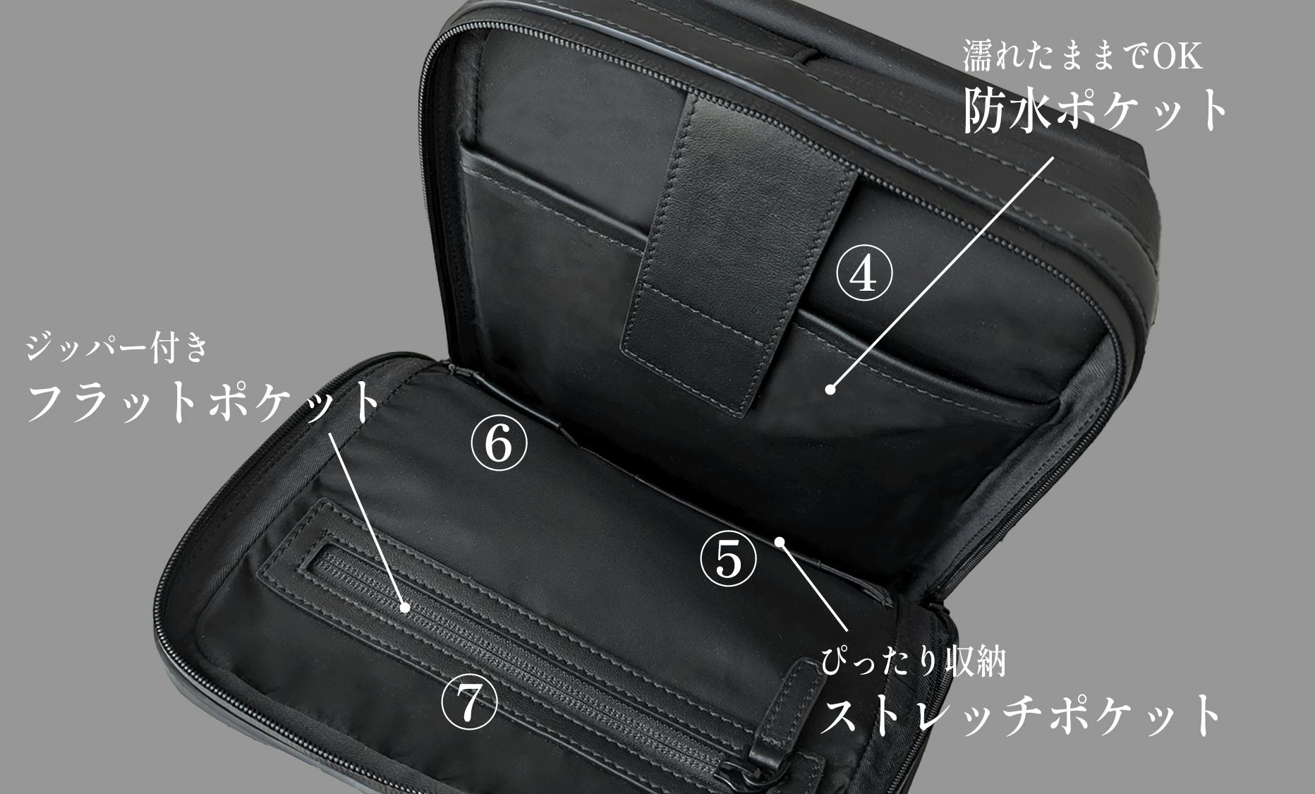 2つのコンパーメントには、合計7つのポケットがあり、それぞれに特徴がございます。