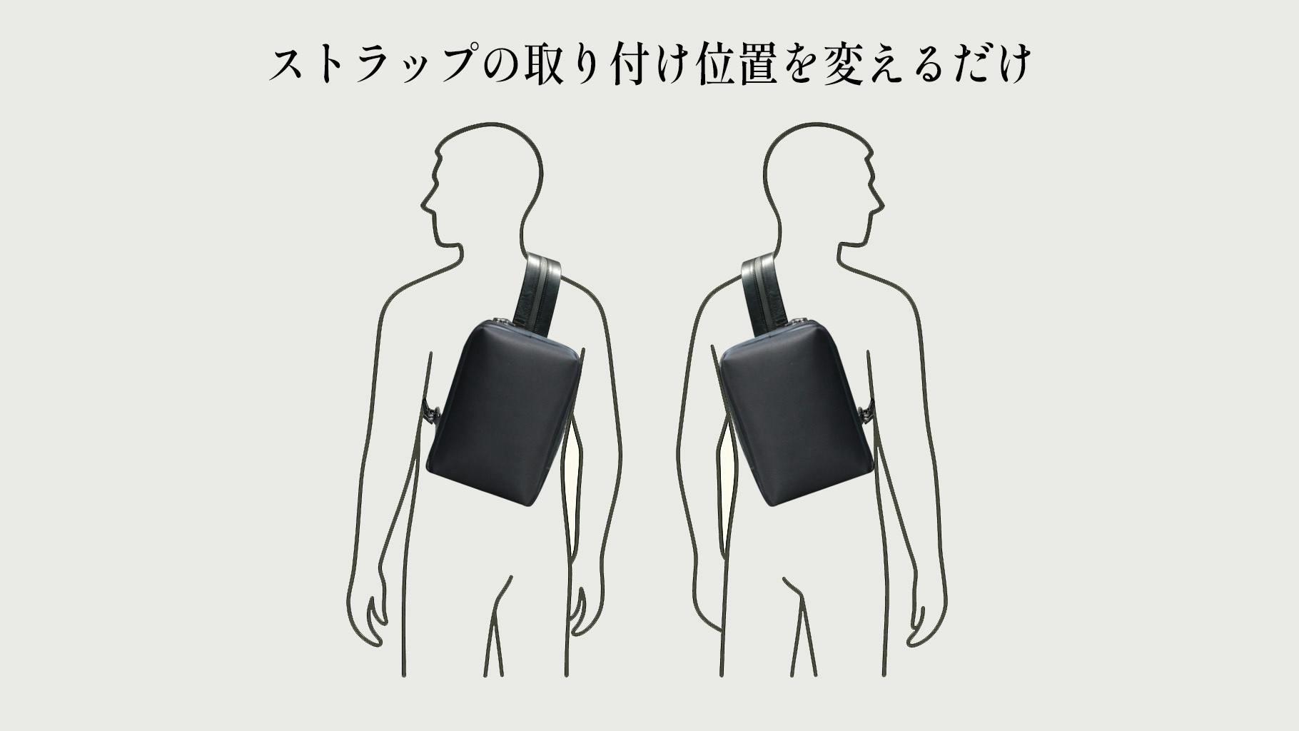 ボディバッグにした場合、ストラップの先を取り付ける場所を変えるだけで、ストラップの方向を変更することができるため、自分の使いやすい方向で使用することができます。