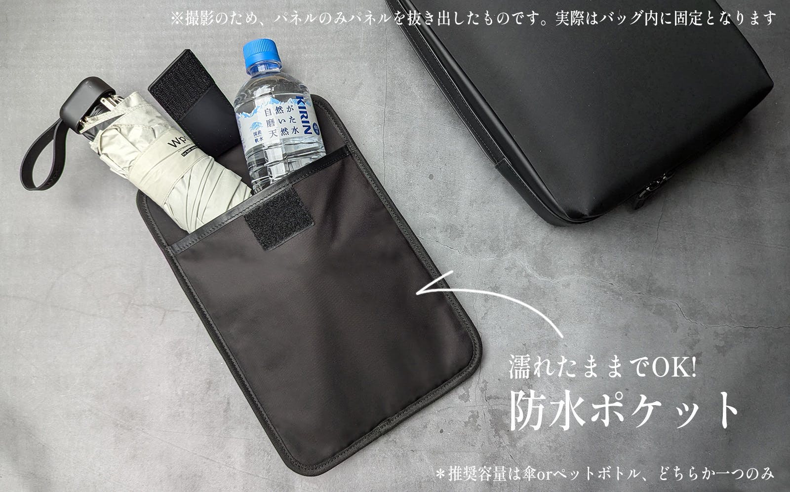 水滴を気にせず使える【防水ポケット】は大きめのペットボトル(600ml)も入るサイズ感です。