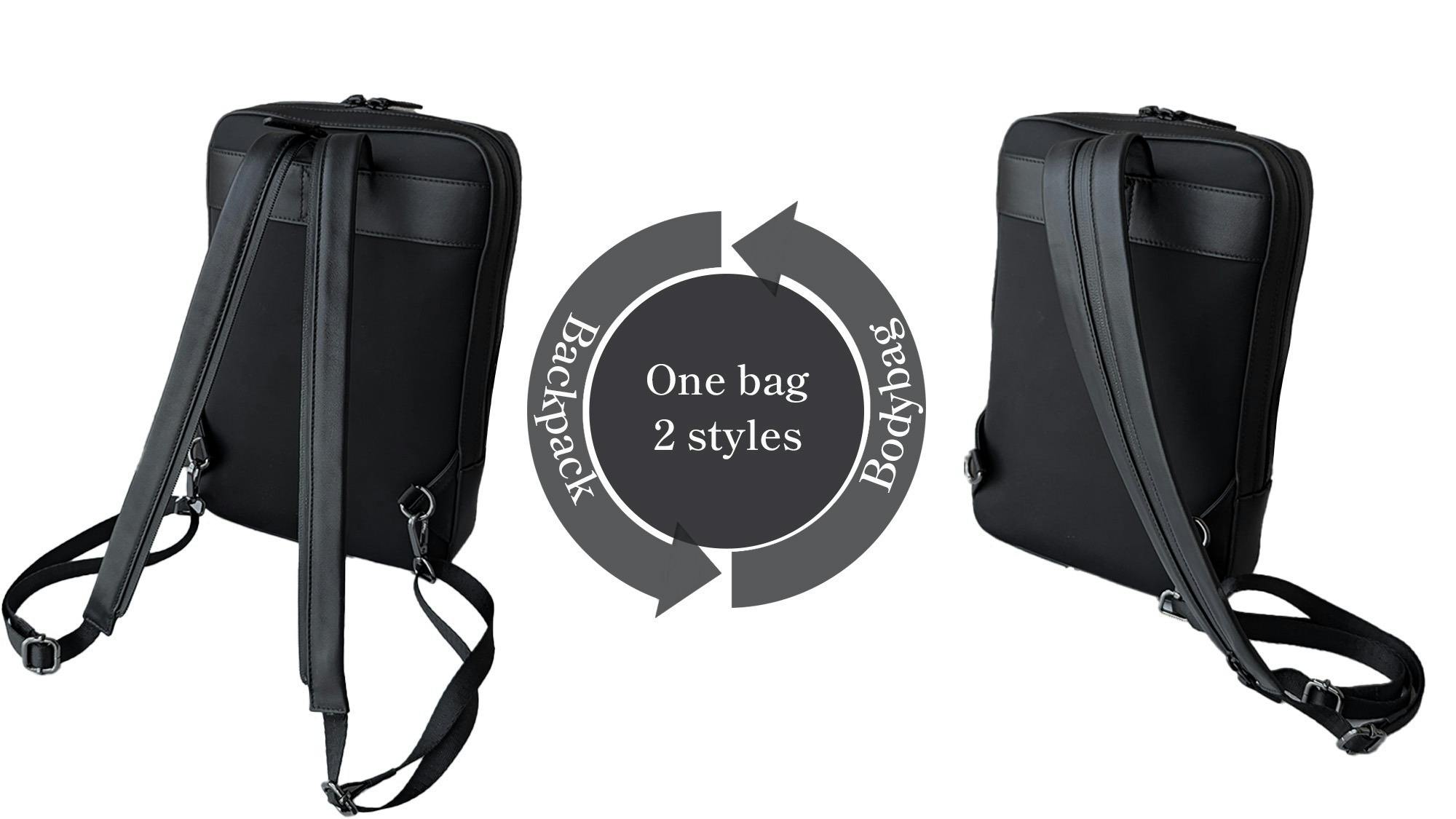 時と場合によってボディバッグからバックパックへ、バックパックからボディバッグへ簡単に変化させることができるから、シーンに合わせて便利にお使いいただけます。