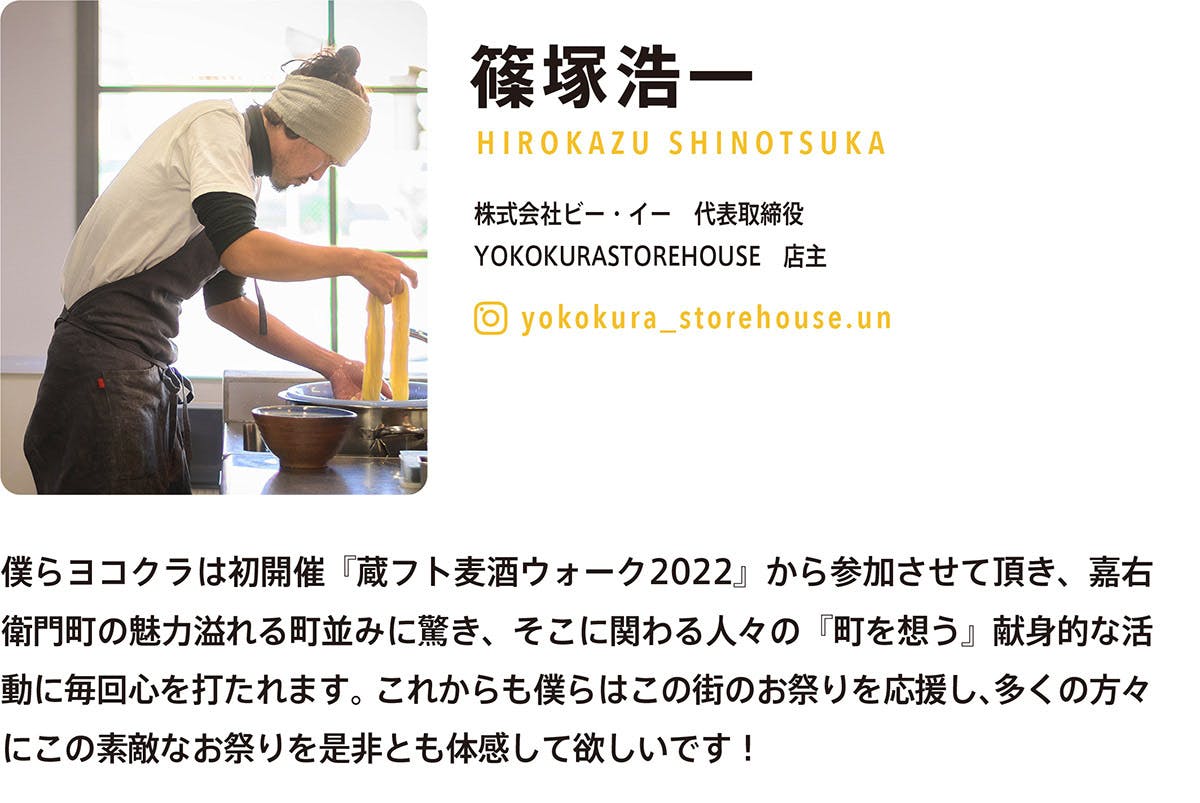 2022年の初回の「蔵フト麦酒ウォーク」から4年連続、今年も参加していただきます、小山市の名店「Yokokura Storehouse」の店主であり、株式会社ビー・イー代表取締役の篠塚浩一さんから応援メッセージをいただきました。ご存知の方も多いかと思いますが、Yokokura Storehouseも蔵フト麦酒ウォークと同様に、お店でありながらも食や人を通じて街の文化を作ることに普段から力を入れられているお店です。今回の2日間も特別な1杯を提供していただけます。