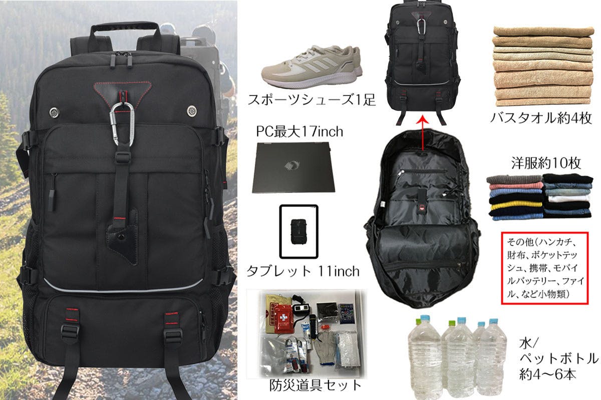 拡張機能により、最大約80L収納可能を実現しました。アウトドア&もしもの時の防災バッグ活用で最大限収納ができます。 このバックが一つあるだけで、まずひと安心です。