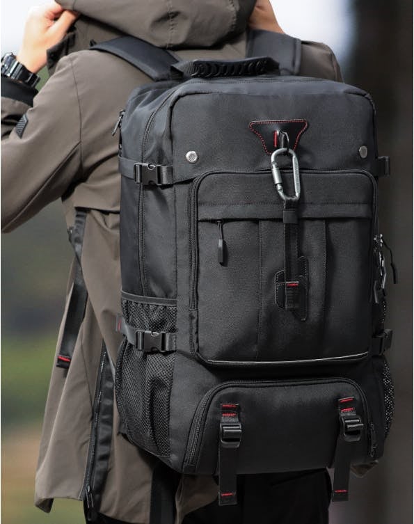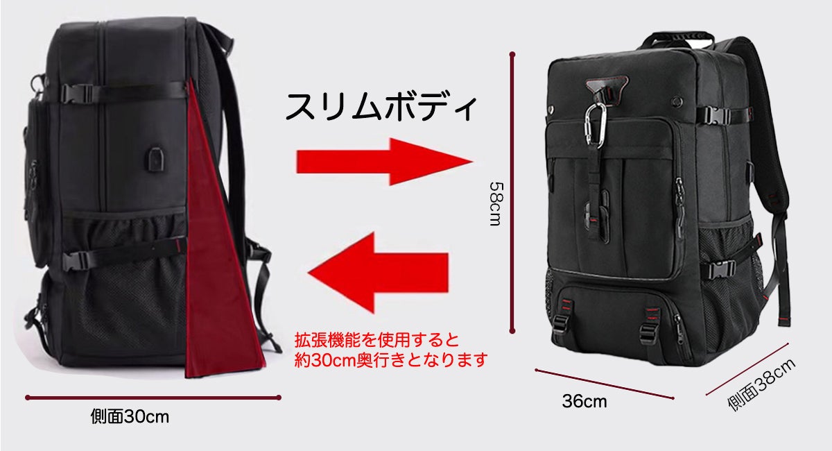 拡張機能により、横幅は8cmを拡張し、無理のない収納を実現しました。荷物が増えても安心!拡張機能で容量が約25%アップ。アウトドアや旅行、防災備蓄にも最適です。