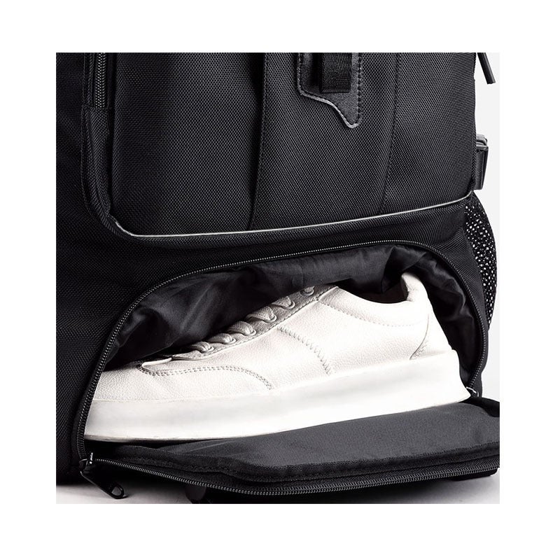 リュックの底部には独立した靴用ポケットを設置。アウトドアやジム、旅行時にも便利で、靴1足分がすっぽり収納可能です。