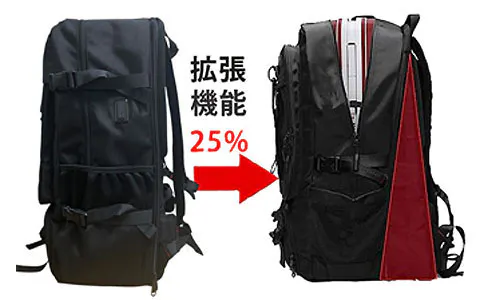 拡張機能により、横幅は8cmを拡張し、無理のない収納を実現しました。荷物が増えても安心!拡張機能で容量が約25%アップ。アウトドアや旅行、防災備蓄にも最適です。