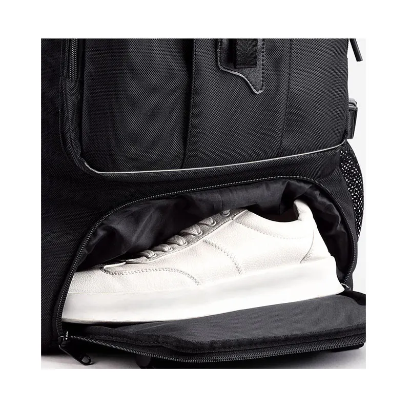 リュックの底部には独立した靴用ポケットを設置。アウトドアやジム、旅行時にも便利で、靴1足分がすっぽり収納可能です。