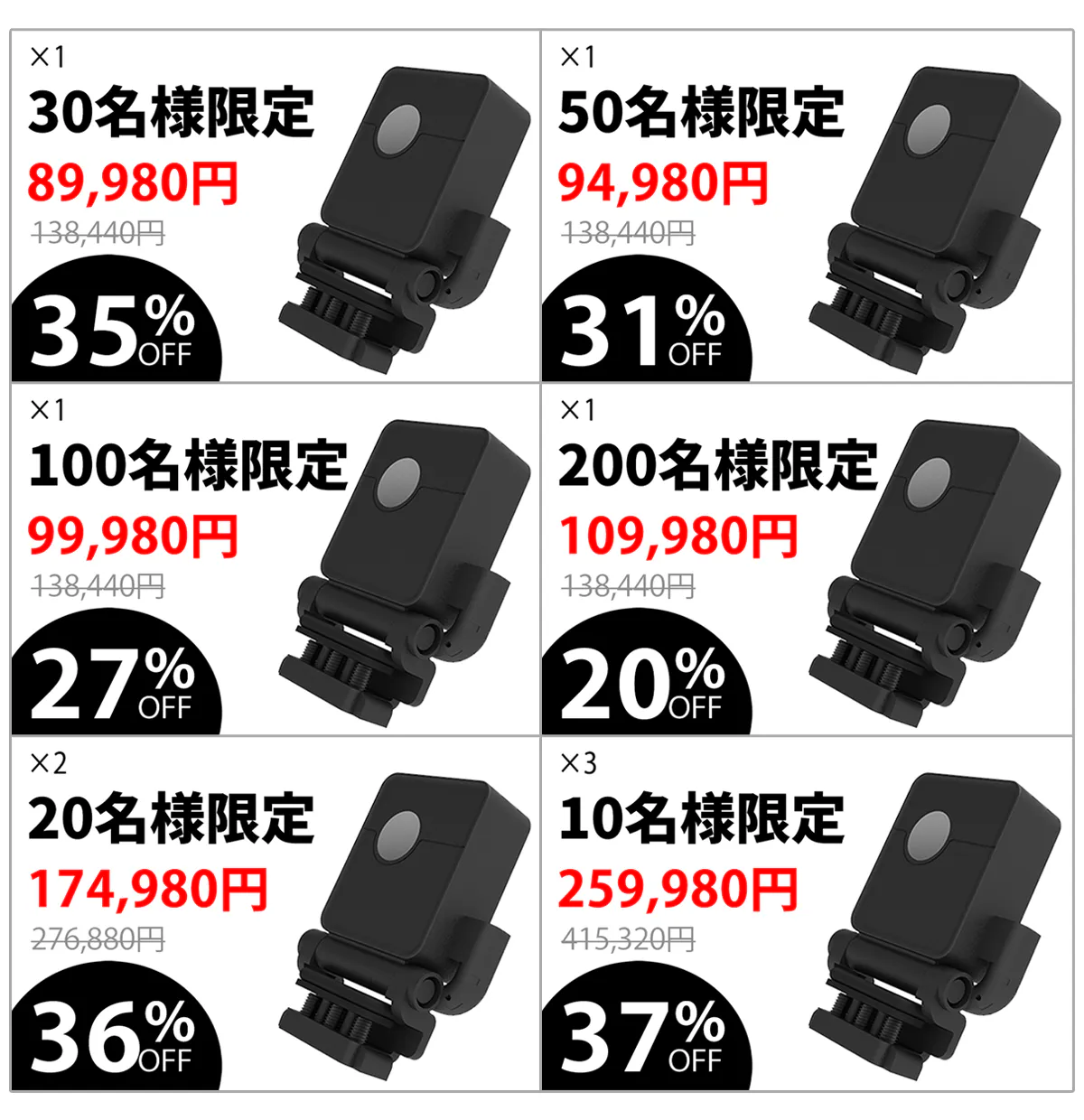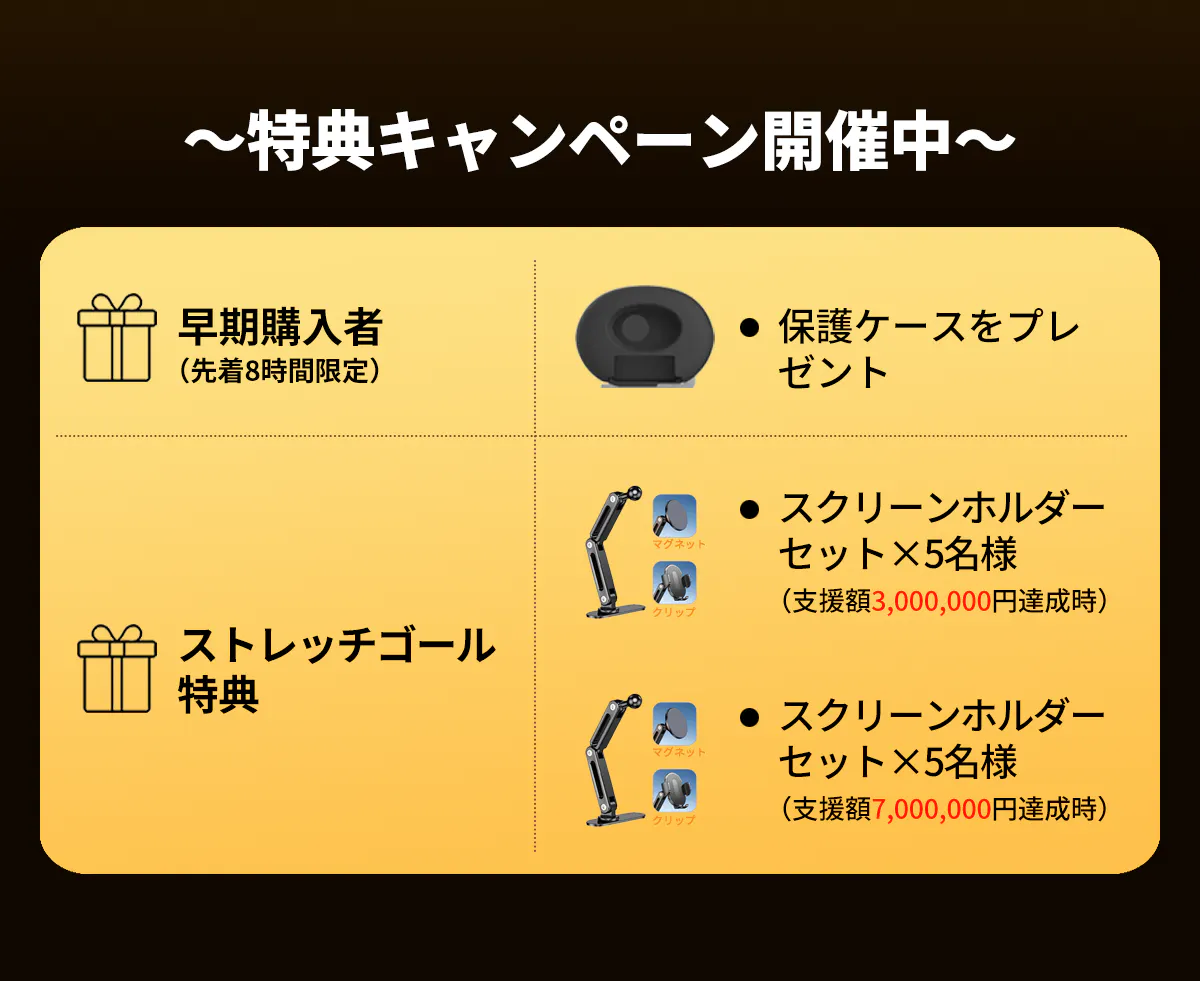 プロジェクト公開から8時間以内に本製品をご購入いただいた、下記の条件を満たした支援者様に専用のカメラ保護ケース(1,999円)を提供いたします。