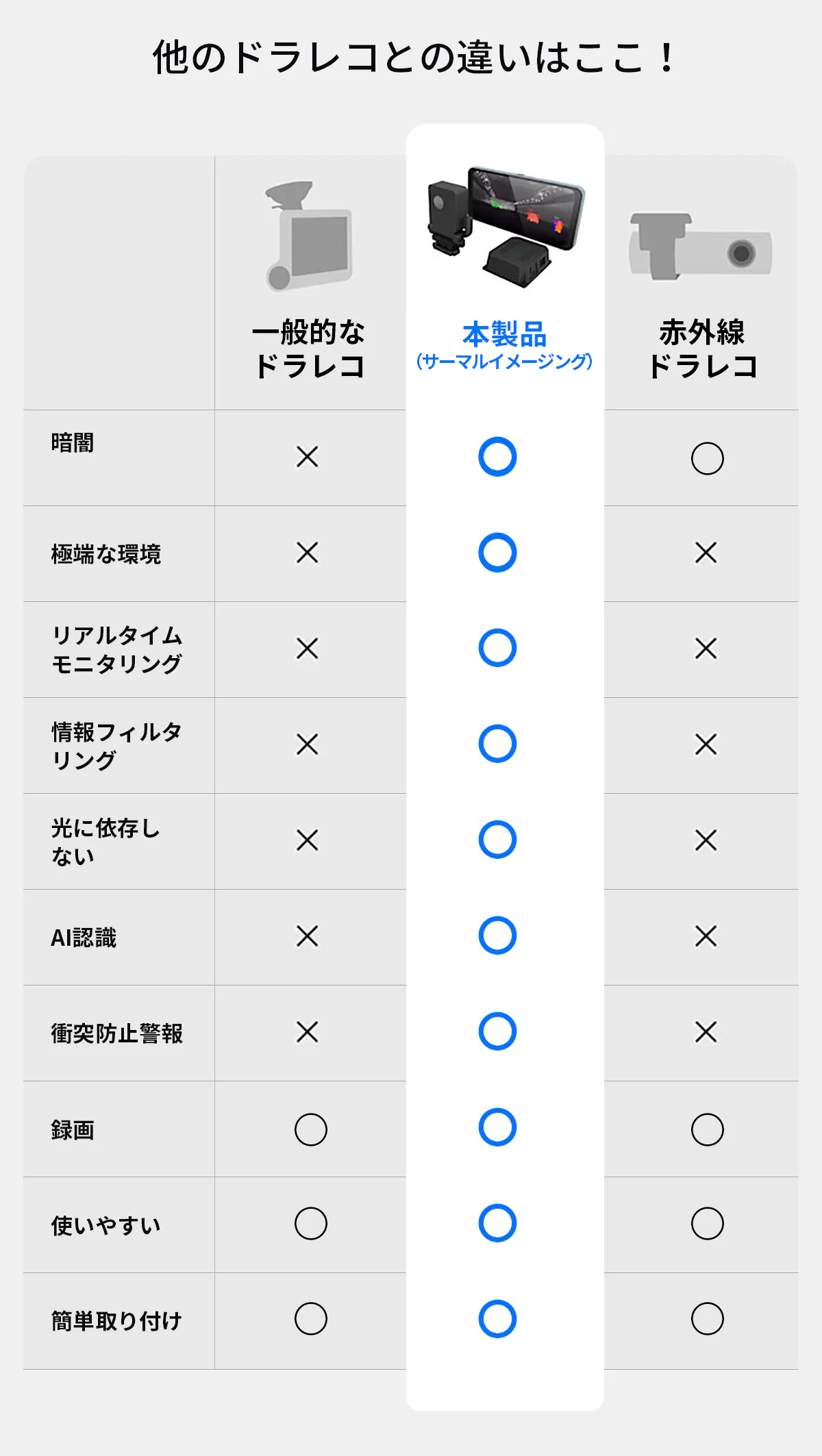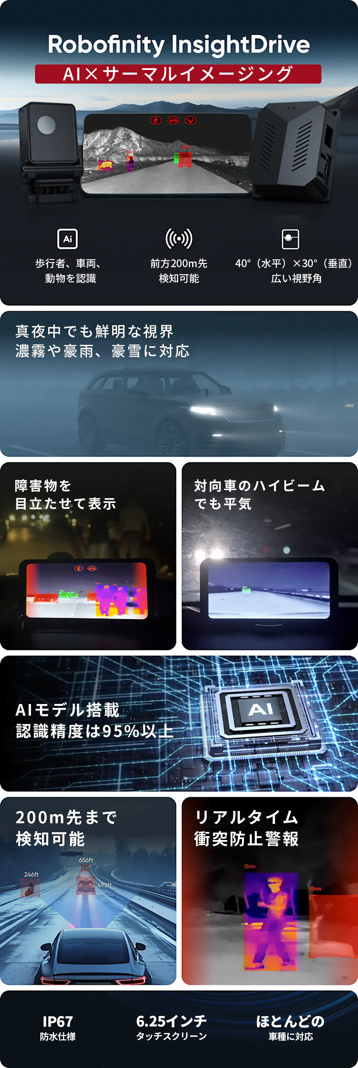 「Robofinity InsightDrive X1」は今までのドライブレコーダーと一線を画し、サーマルイメージング技術×高精度AIを集約した次世代サーマルイメージングドライブレコーダーです。目視や一般的なドライブレコーダーに比べて、道路における潜在的な危険をより精確に検出し、事故を未然に防ぐことが可能!