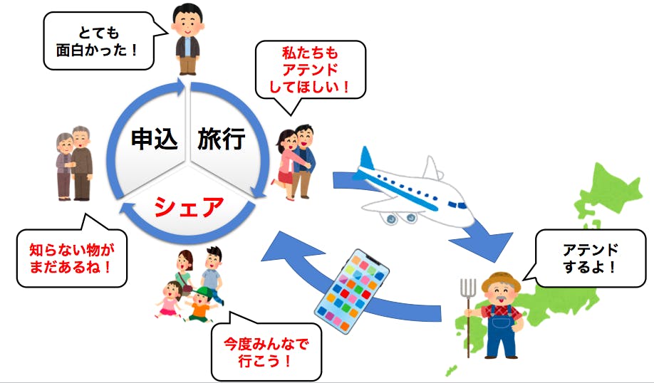 このような循環を生むことで、今まで埋もれてた有益な情報を発信するアテンダーを目当てに地方に訪れる人が増え、マンネリしつつある旅行がより新鮮で魅力な旅行になります。