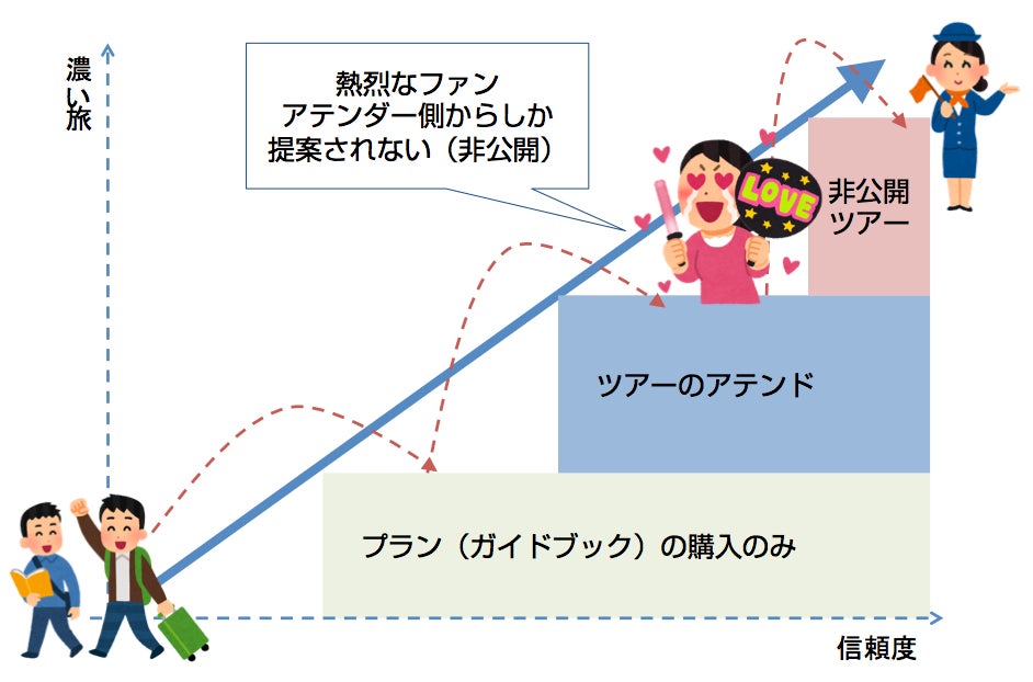 トラベラーにとっては「アテンダー」のサービスを気軽に使うきっかけとなり、アテンダーにとっても自信のある旅程プランを体験してもらうことで、自分自身に興味を持ってもらうきっかけとなります。