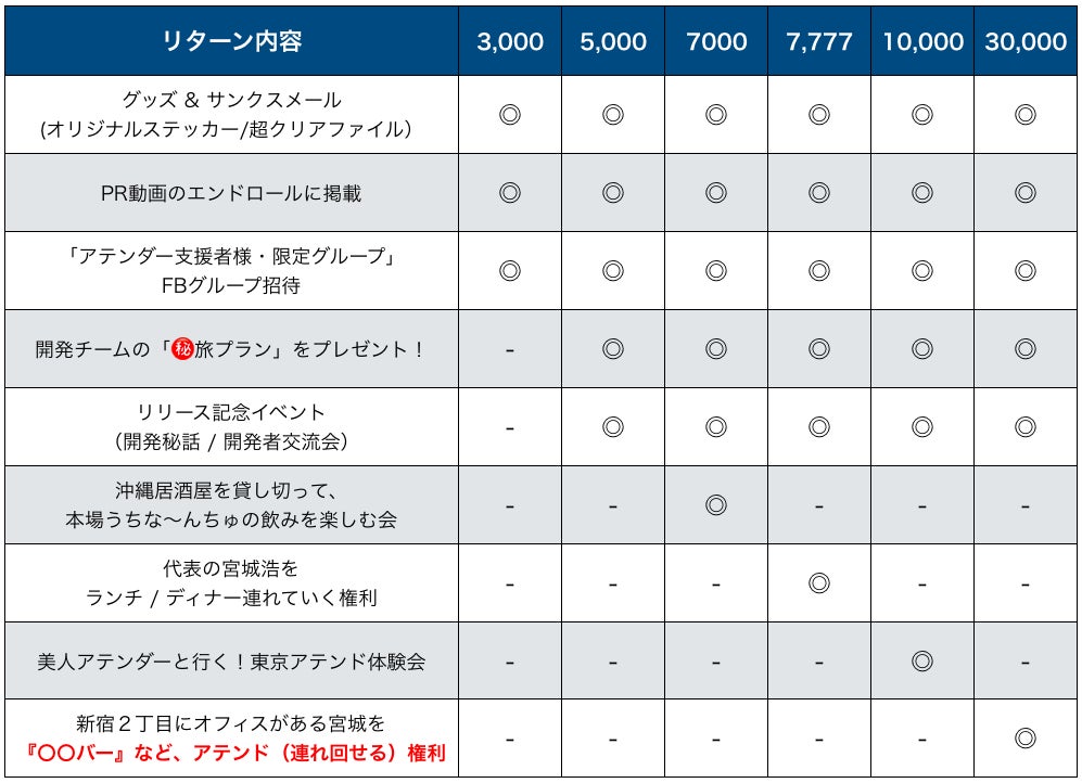 支援頂いた方はサービス公開前にいち早く触れ、意見が言える秘密のFBグループへご案内し、共に「アテンダー」を盛り上げてくれる仲間としてお付き合いさせて頂きたいと考えております。