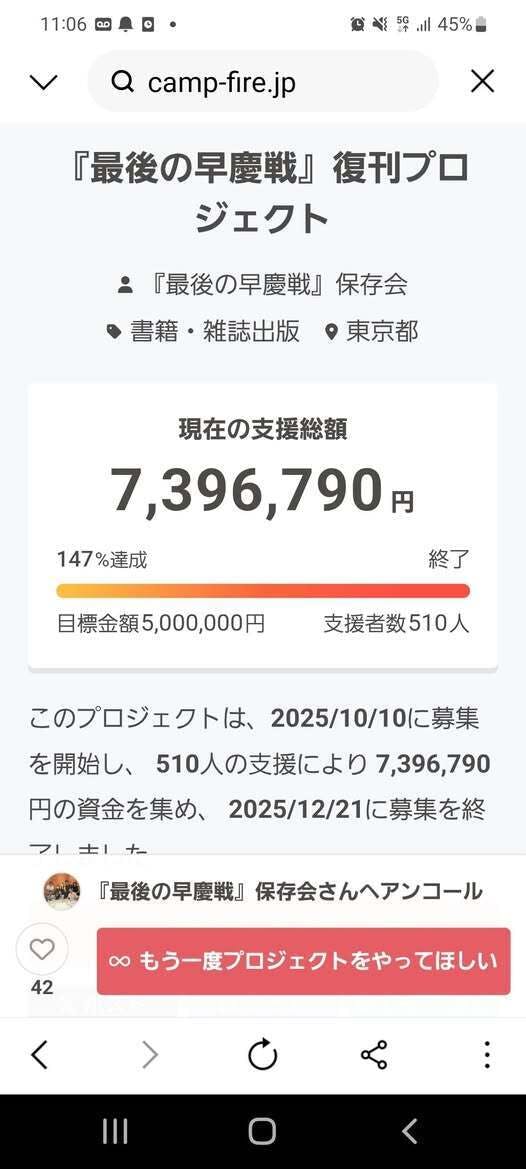 2025/12/28 19:13慶應義塾の絆、早慶の絆、球縁の絆、スポーツの絆、平和を願う絆、本当に沢山のご縁を頂き、かけがえのない何よりの宝物です。18名の賛同者、110名のサポーター、160を越える三田会・稲門会・企業・団体の皆様に支えて頂き、全国的な活動ができました。メディアにも多数取材して頂きました。そのお陰で、510人からのご支援で約740万円の資金が集まりました。直接ご支援頂いた方も含めますと、更に大きな数字になります。この資金を1円も無駄にすることなく、責任を持って有意義な活動に使わせて頂きます。詳細は、ホームページ上でご報告させて頂きます。クラウドファンディングの終わりは、『最後の早慶戦』の復刊準備のスタートになります。この物語の普及と後世に語り継いでいく活動を休むことなく続けて参ります。今後とも宜しくお願い申し上げます。『最後の早慶戦』保存会中野雄三郎【ホームページ】https://saigo-soukeisen.com【クラウドファンディング】https://camp-fire.jp/projects/872741/view#menu【紹介動画】https://youtu.be/D4LjqYK5hNI〈メディア掲載〉■毎日新聞12月3日朝刊16面https://mainichi.jp■毎日新聞オンライン https://share.google/pOUnT5CFzLDPtEMdS■産経新聞https://share.google/bsPOZo3joK8VJVb7W■スポーツ報知 https://share.google/BggQWgHTvHFvcGaWX■12月19日中國新聞、11月被団協新聞、三田評論、三田ジャーナル、塾生新聞、ケイスポ、稲門会会報12月、早稲田スポーツ他、ANDTV もっと見る