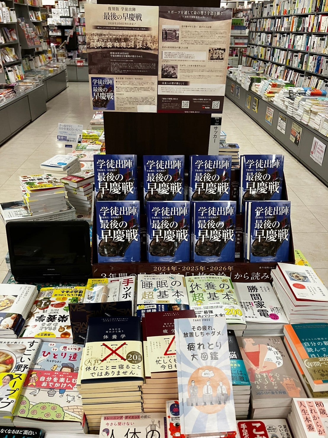 2026/04/08 00:30丸善日吉東急アベニュー店。ドーンと大きく2箇所で展開中!ありがたいことです。3/9発売時はDVDプレイヤーで動画を流していただきました。この画像そうです。いまはもう取り外されています。今週、いよいよ春季リーグ戦が開幕する。戦力は、昨年より数段パワーアップしていると聞く。優勝して英霊たちに応えたいですね^ - ^紹介動画https://youtu.be/D4LjqYK5hNI『最後の早慶戦』保存会HPhttps://saigo-soukeisen.com最後に、重ねてのお願いとなり誠に恐縮ではございますが、書籍の普及のため、SNS等を通じて広く周知いただけましたら幸いに存じます。その際のハッシュタグは「#最後の早慶戦」にてお願い申し上げます。 もっと見る