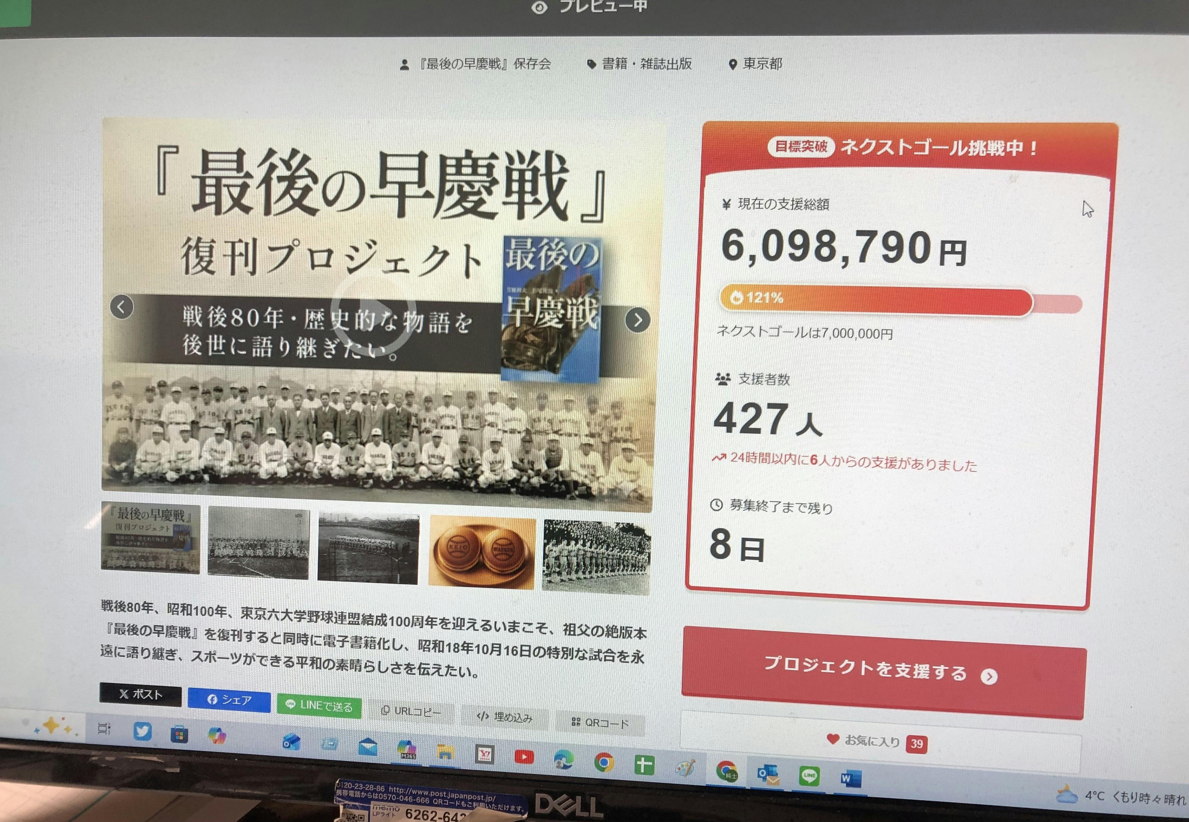 [法人様向け] ※複数口お申込み可能。 ●【本文巻末広告掲載】 『復刻版 最後の早慶戦』に、支援者(法人様・各三田会様・各稲門会様)のモノクロ広告を掲載します。 ・掲載サイズ:タテ50×ヨコ75mm ・複数口お申込みの方は、口数に応じたサイズの広告を掲載いたします。 例.3口⇨1ページ 6口⇨見開き ●赤坂青野「早慶ボールマーク入り特製どら焼き」10個 ※2026年2月頃発送予定 ●書籍10冊 ※2026年2月頃発送予定 ●お礼メール ※複数口お申込みの場合は、返礼品も口数分増えますが、お礼メールは1通とさせて頂きます。数が不要な場合は、書籍とどら焼の必要な数だけ備考欄にご記入ください。 ※【重要】お申込みの際、備考欄に、以下について必ずご記入ください。 ①ご紹介者様(いない場合は「なし」と記入) ②お申込みのきっかけとなった媒体、ご案内等 ③ご所属の団体、稲門会、三田会等の名称 ④広告の件については、キャンプファイヤーにご登録のメールアドレス宛てに別途ご連絡致します。 ※シルバーコース以上の方は、申込フォームの「支援者名」に書籍に掲載する漢字のご芳名を必ず入力して下さい。ローマ字のみでお申込みの場合は、書籍へのご芳名掲載は出来ませんので、ご了承下さい。 ※どら焼きの賞味期限8日。原材料及び添加物等の食品表示はお届け商品のラベルに表記されます。 商品開封前には必ずお届けのリターンに貼付されたラベルや注意書きをご確認ください。
