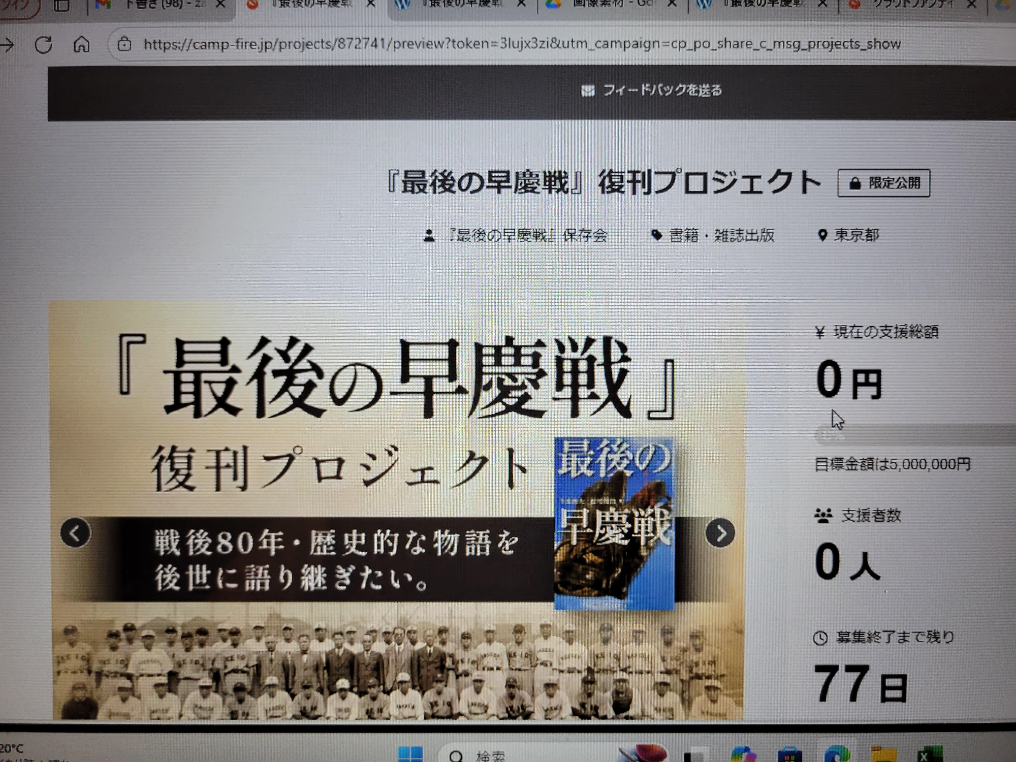 本当に沢山の皆さまのお陰で、無事にクラウドファンディングをスタート出来ました。三田ジャーナル(9月)、三田評論(10月)にも掲載いただきました。稲門会会報(12月)にも掲載予定です。皆さまからの沢山のご支援と応援に、心より感謝申し上げます。戦後80年、スポーツを通して、戦争と平和について考える活動を広げ、この物語を後世に語り継いでまいります。この活動にご賛同いただけるようでしたら、各三田会・稲門会・OB会等に展開していただき、SNS等でも拡散いただけると幸甚です。■クラウドファンディングhttps://camp-fire.jp/projects/872741/view#menu