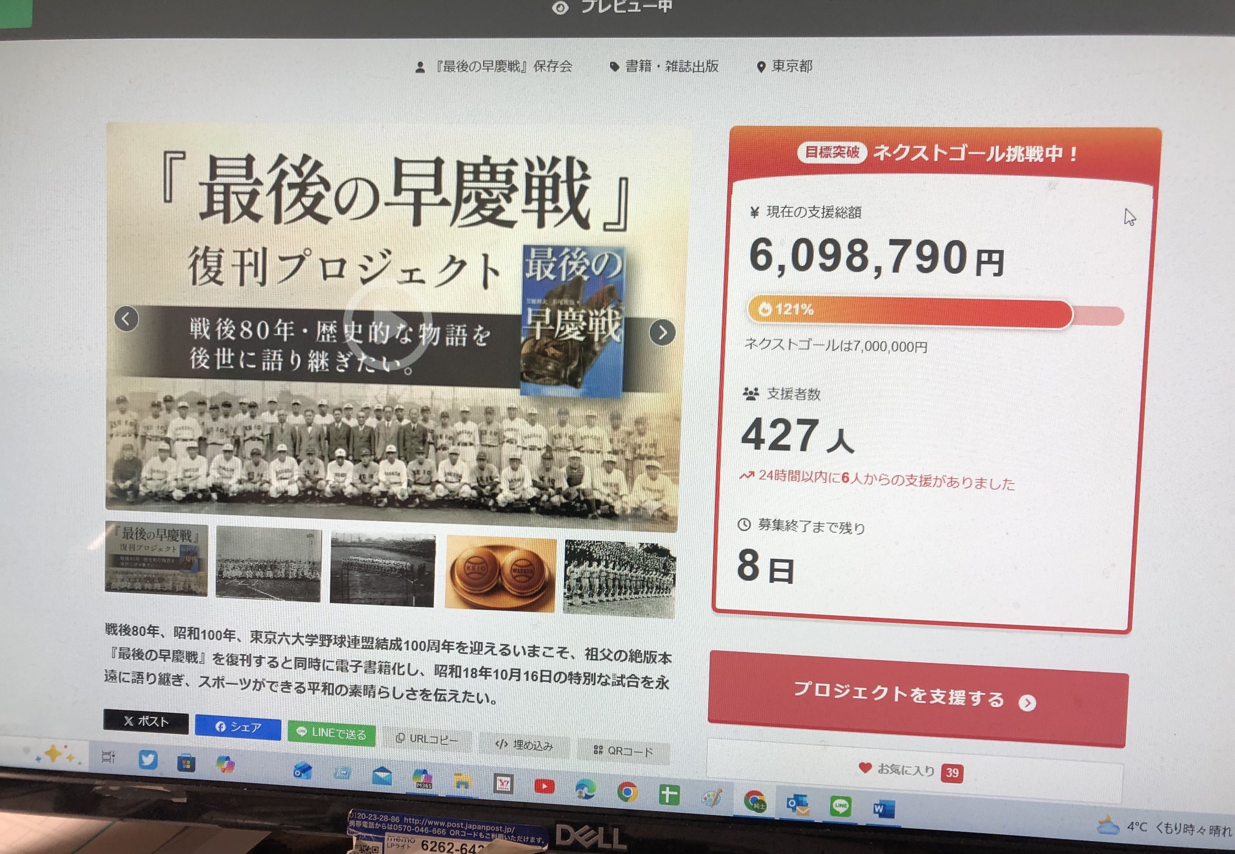 クラウドファンディングの支援者の方が440名、賛同者の方が18名、サポーターの方が107名、三田会・稲門会等の協力団体・メディア様が160を越えて、皆さまのお陰で全国的な活動展開をさせて頂いております。最近はメディアにも取り上げていただいております。お忙しいとは思いますが、皆さまに知ってもらえるだけでも嬉しいです。動画が一番手軽に見れます。 【クラウドファンディング】(12月21日迄)https://camp-fire.jp/projects/872741/view#menu【紹介動画】https://youtu.be/D4LjqYK5hNI〈メディア関連〉■毎日新聞12月3日朝刊16面https://mainichi.jp■毎日新聞オンラインhttps://share.google/pOUnT5CFzLDPtEMdS■産経新聞https://share.google/bsPOZo3joK8VJVb7W■スポーツ報知 https://share.google/BggQWgHTvHFvcGaWX■被団協新聞、三田評論、三田ジャーナル、塾生新聞、ケイスポ、稲門会会報12月予定、早稲田スポーツ他、ANDTV