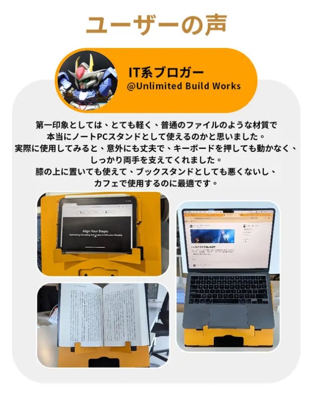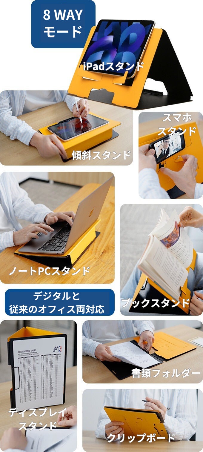 Workelfは見た目は普通の書類バインダーですが、ノートPCスタンド、iPadスタンド、スマホスタンド、傾斜スタンドに変形できます。