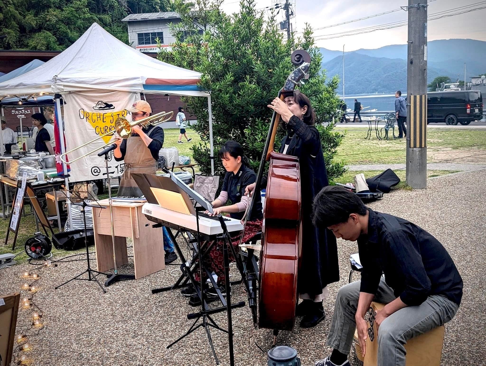 現在は、福知山市内にとどまらず、丹波市、舞鶴市、宮津市、豊岡市、伊根町のイベントにも積極的に出店し、変わらず食事と生演奏を提供するスタイルを続けています。