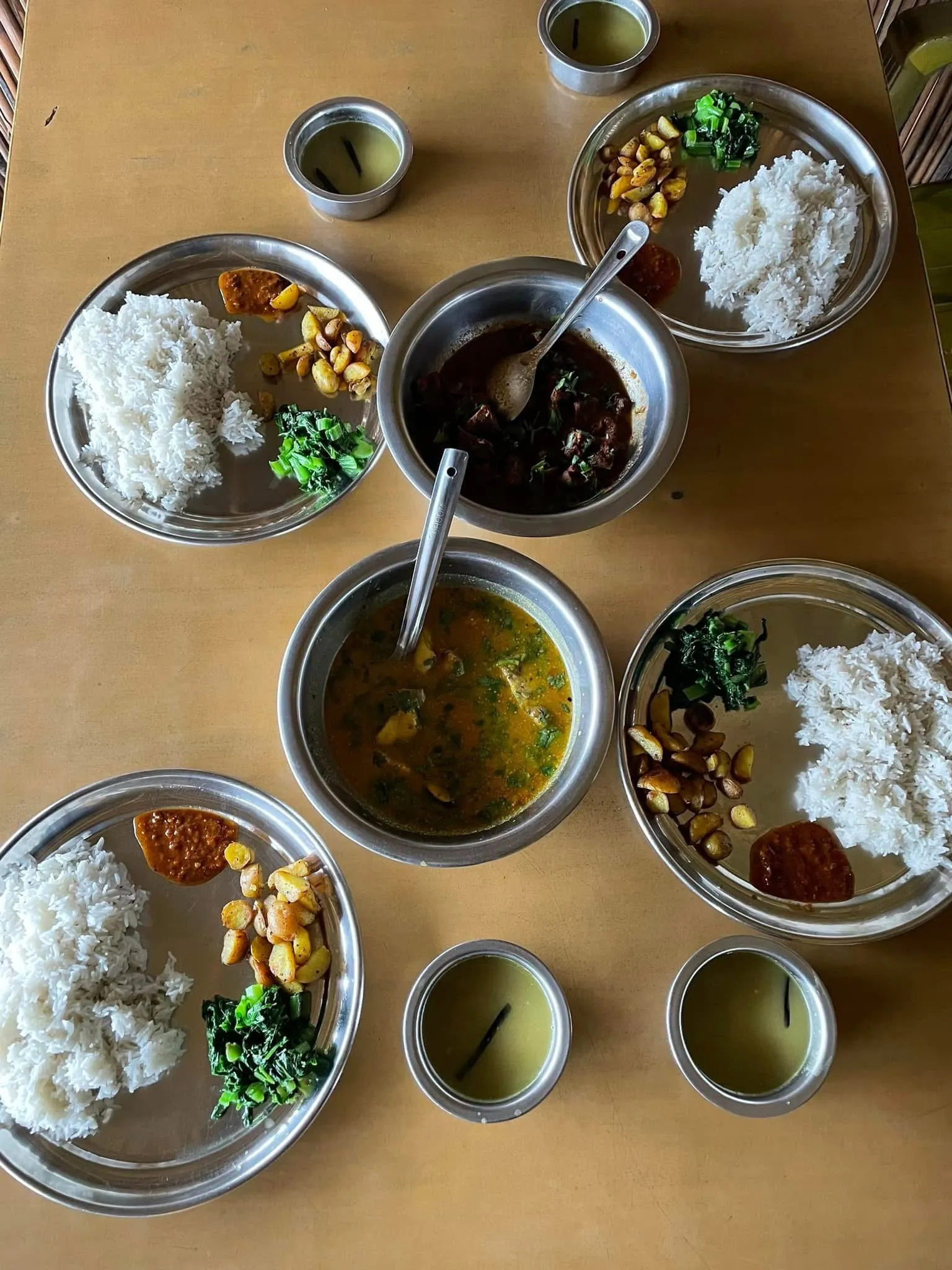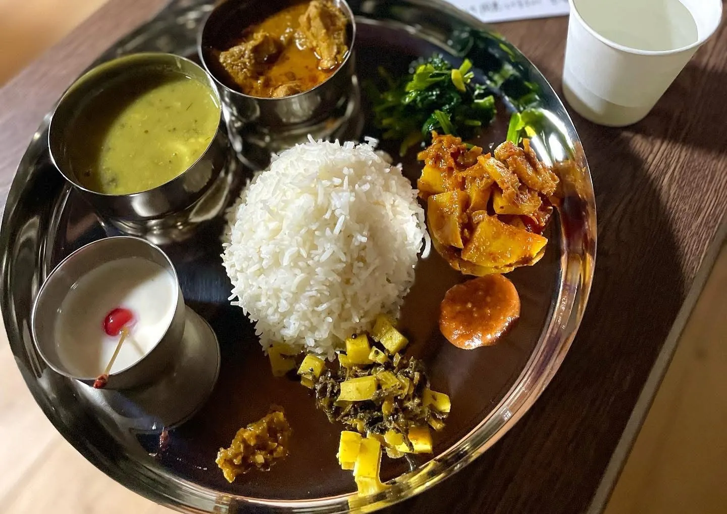 いわばネパールのカレー定食といえる、カレー、白米、野菜をふんだんに使った副菜を1枚の大皿に盛り合わせた料理です。
