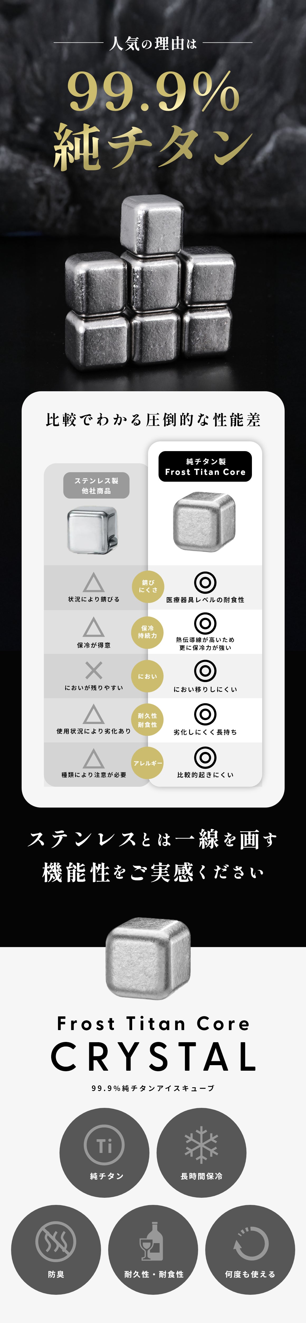 今回の【Frost Titan Core CRYSTAL】は、大人気シリーズの第三弾です。前回策よりもチタン美しさ向上し、機能も高まることで、実用性と所有感を両立したアイスキューブが完成しました。