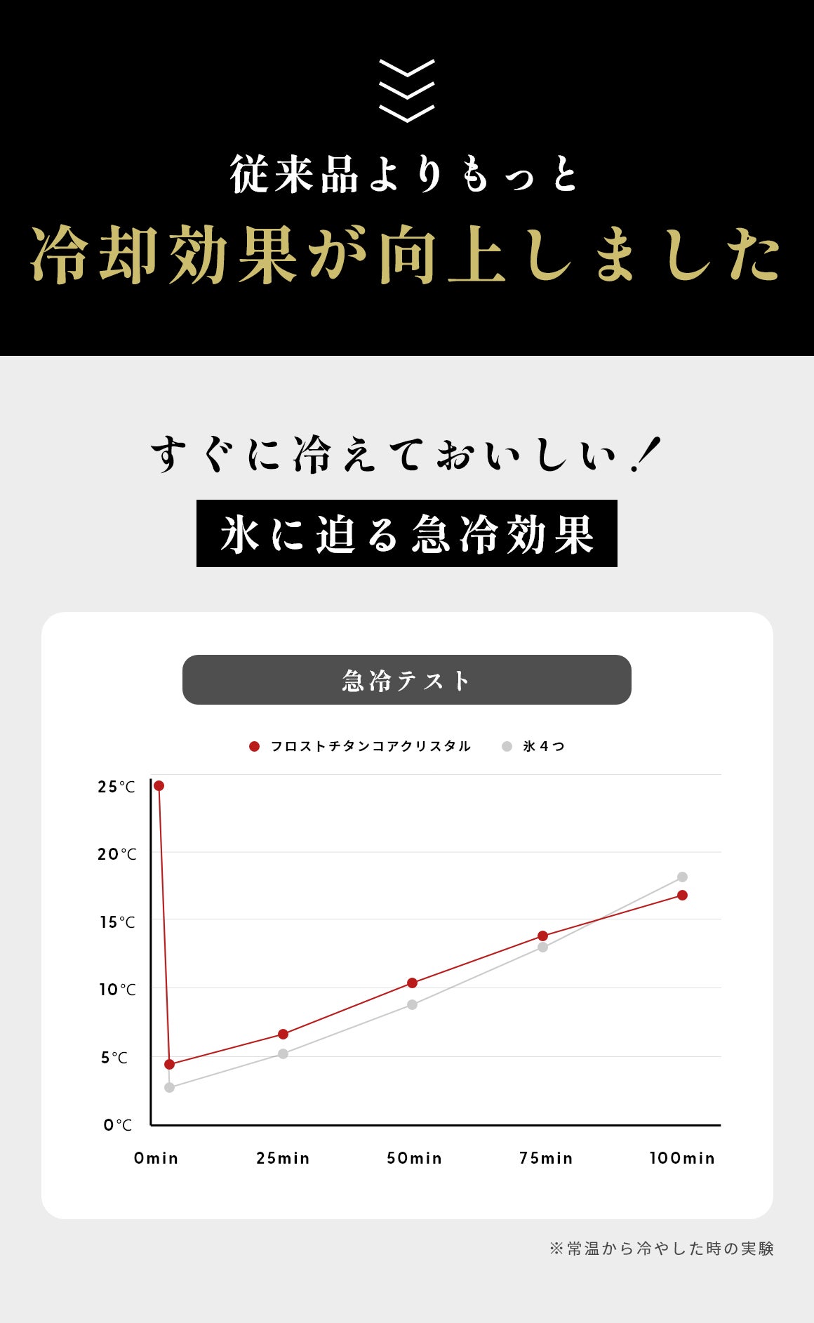 改良により熱伝導率が向上し、グラスに注いで数分で冷える冷却力を実現しました。まだまだ氷よりは劣るものの飲み物を冷やしつつ、味は一切薄まらない。