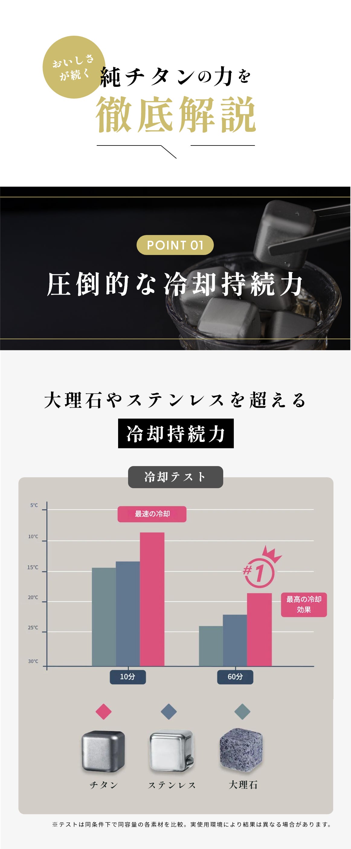 一般的な大理石製アイスキューブやステンレス製アイスキューブと比べても高い冷却・保冷効果を記録し、10分後・60分後、どちらの時点でも最も低い温度をキープし、飲み物の美味しさをしっかり守っています。