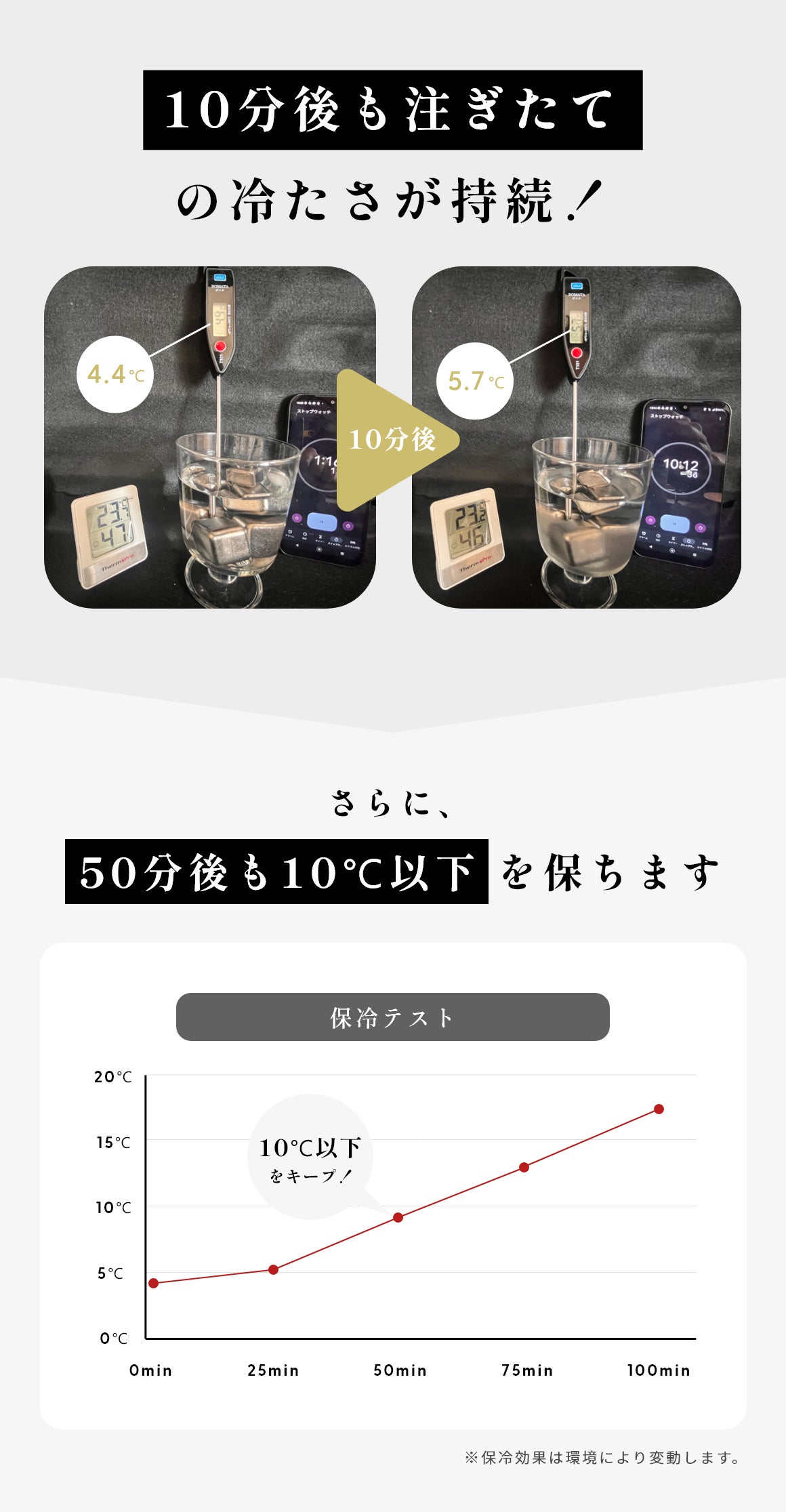 実験では、注ぎたてと同等の冷たさを10分後もキープし、さらに50分後でも10℃以下を維持する結果に。