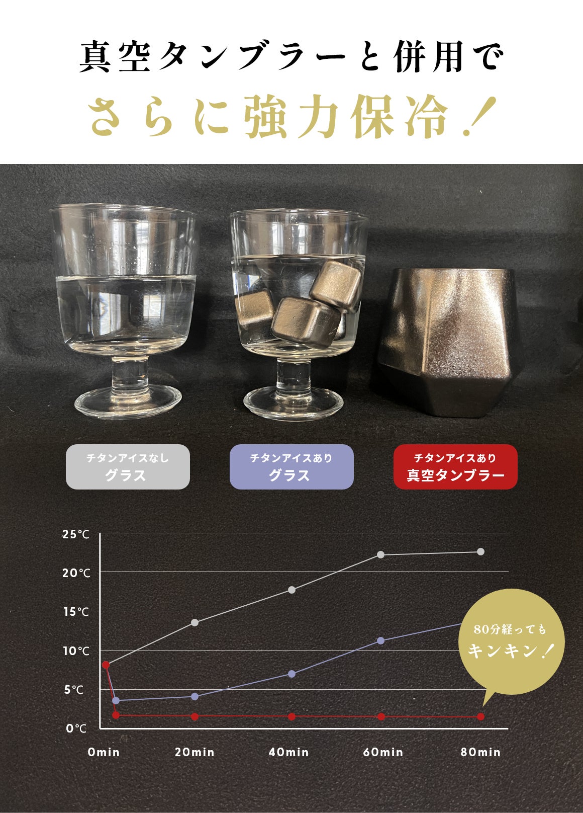 高い保冷力を誇るチタンキューブに、真空タンブラーを組み合わせることで冷たさをさらに長く持続。外環境の影響を受けにくくなるため、飲み物の温度変化を最小限に抑えられます。多少薄まりますが氷と併用することも、超急冷+保冷の効果を享受できるためオススメです。